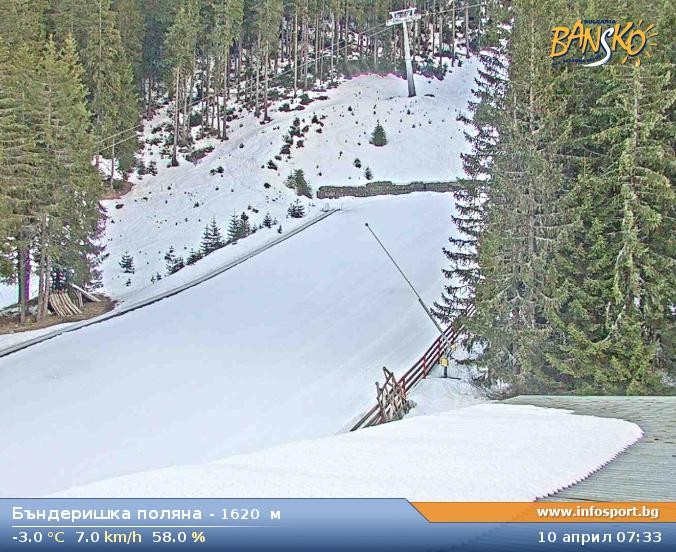 Archived webcam image showing Bansko Ski Resort: Bunderishka polyana on 10 Apr 2026 at 07:38 07:00