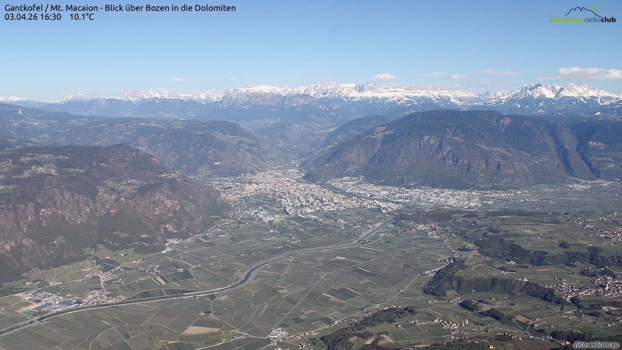 Located at the mountain Gantkofel the webcam is looking east towards Bozen in South Tyrol.