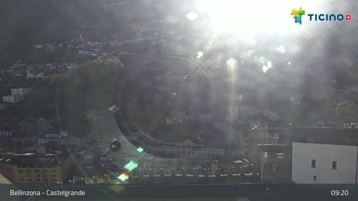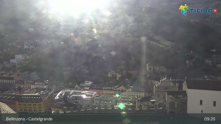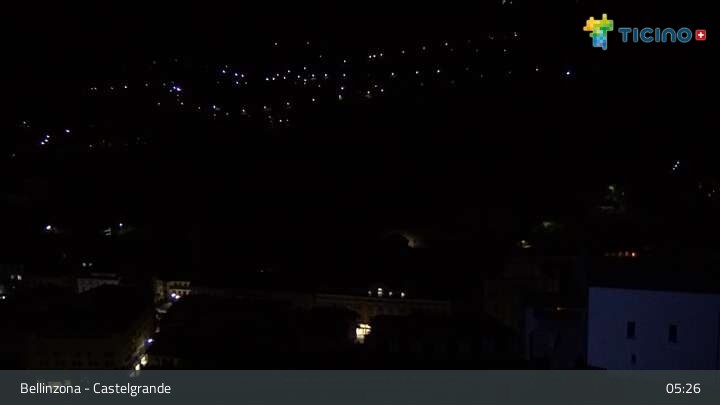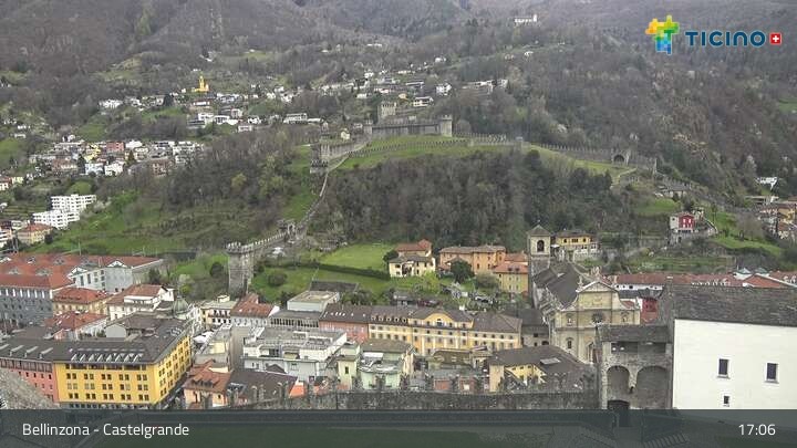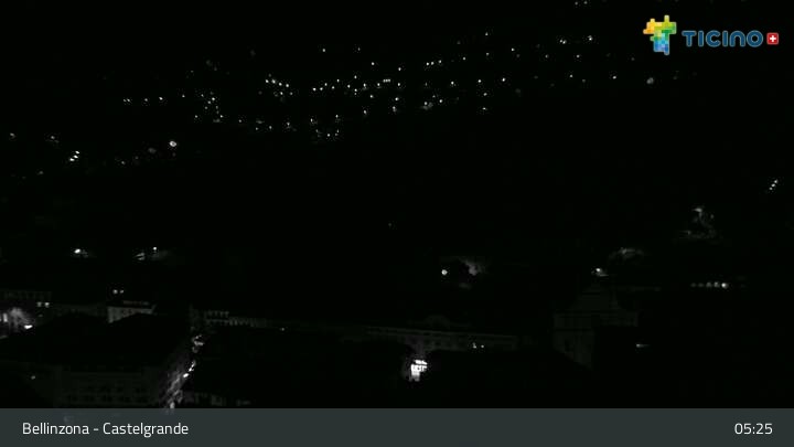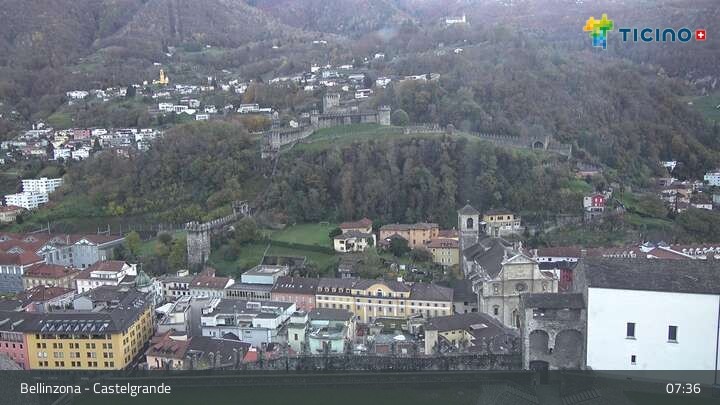 The webcam looks upon the town of Bellinzona, surrounded by the Swiss Alps. You can see Castelgrande castle, which is a UNESCO World Heritage site.