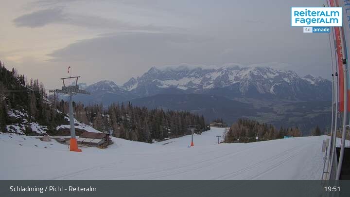 The webcam is located at the mountain station of Preunegg lift in the Reiteralm ski resort and shows the intermediate slope number 5.