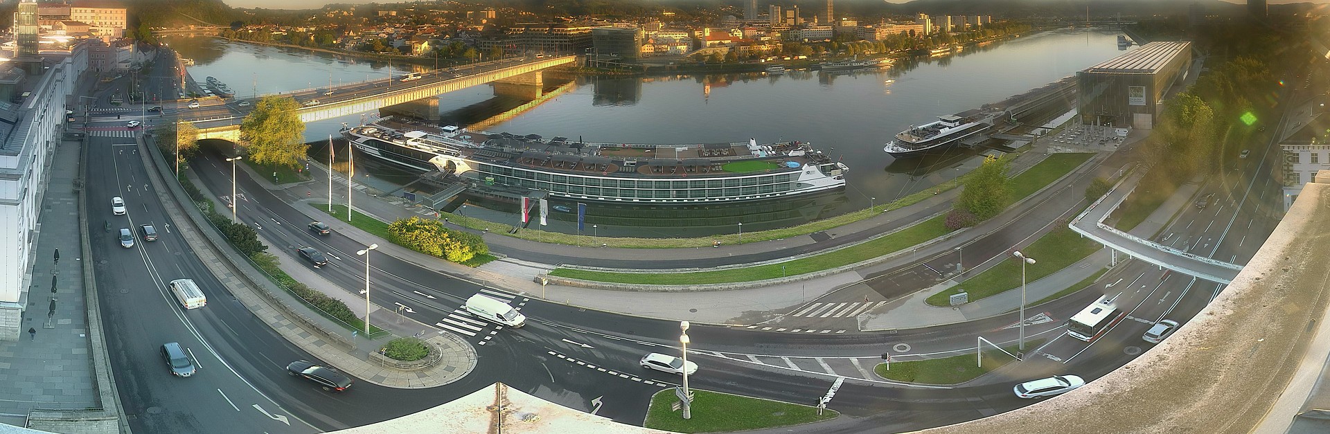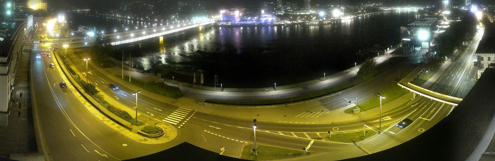 Panoramic view of the Generali building at the Danube and the Nibelungen Bridge.