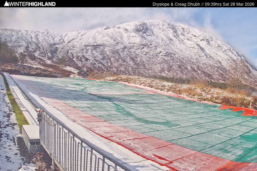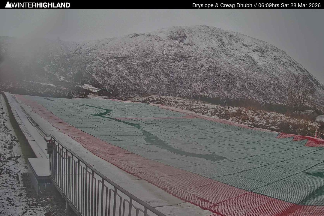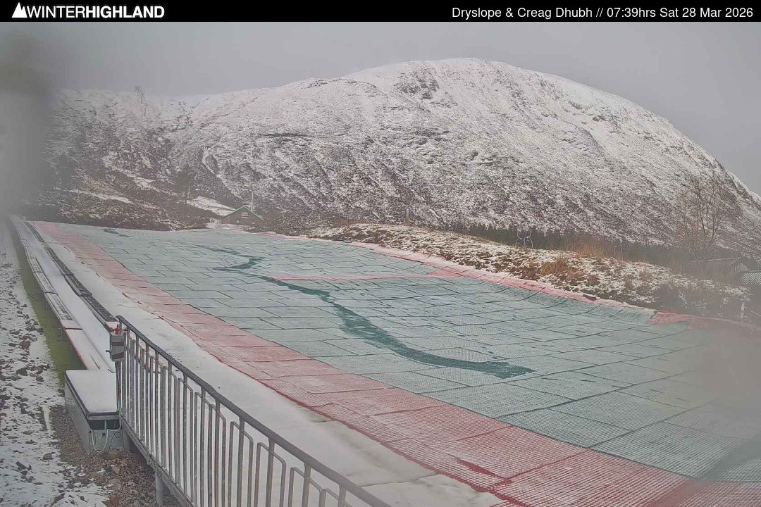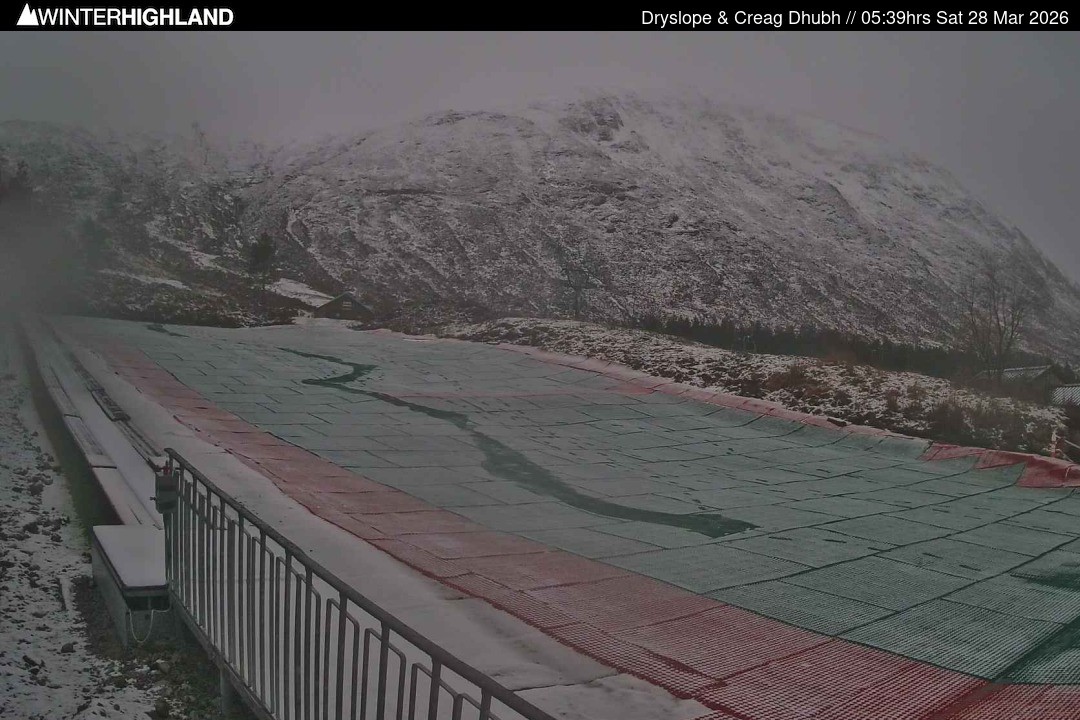 The webcam shows the dry slope in the Glencoe Mountain ski resort in Scotland.