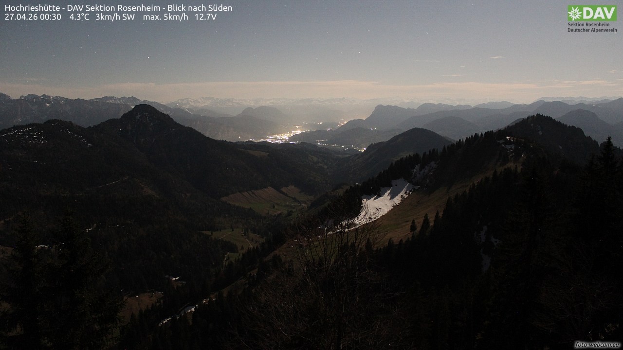 The webcam is located on a tree below the Hochrieshütte on the summit of the Hochries in the area Samerberg, south of Rosenheim. In the distance Kufstein can be seen in the middle, on the left there is the Spitzstein and in the background there is the Kaisergebirge.