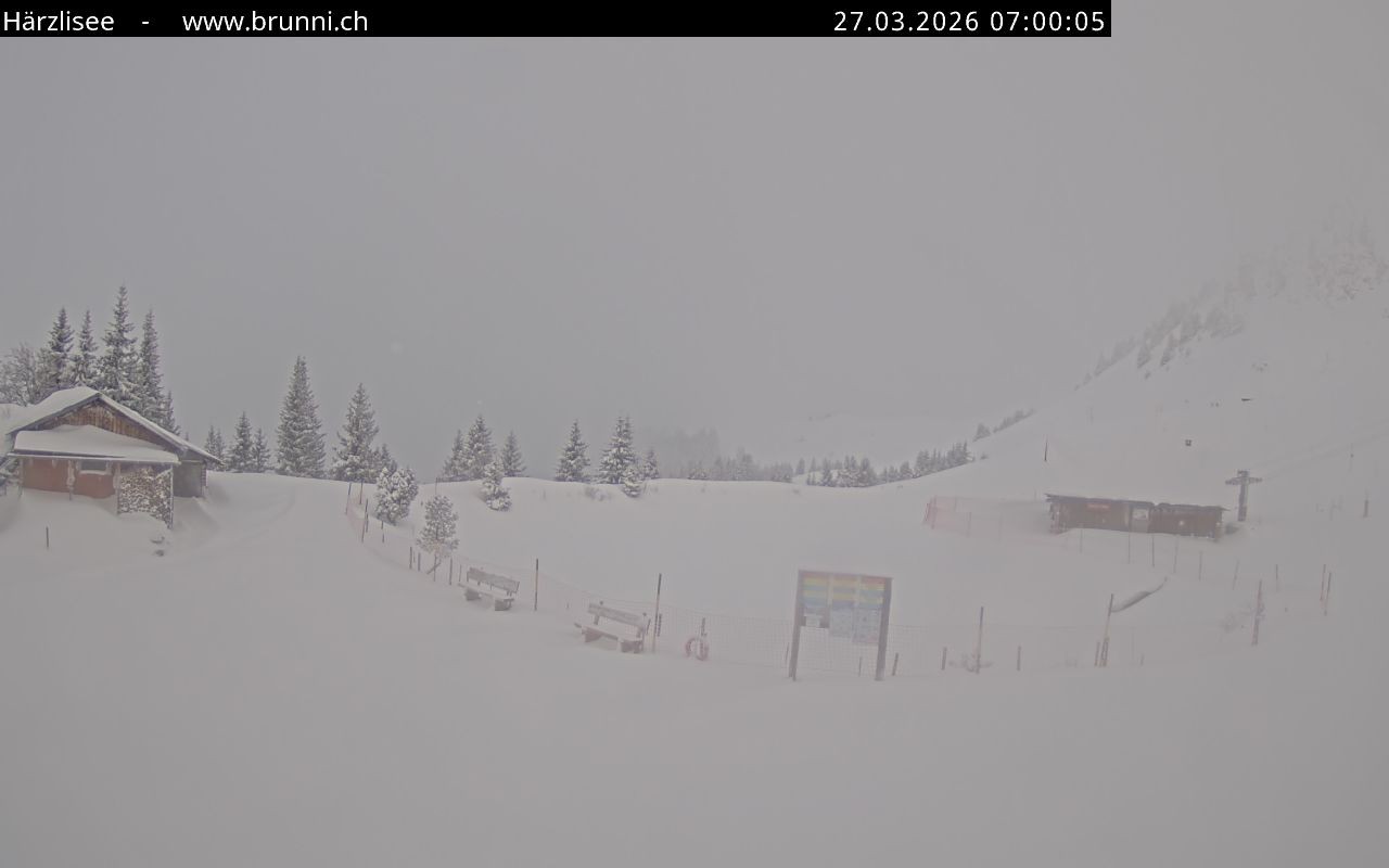 Archived webcam image showing Engelberg: Lake Härzlisee & mountain restaurant Kräuterhütte on 27 Mar 2026 at 07:00 06:00