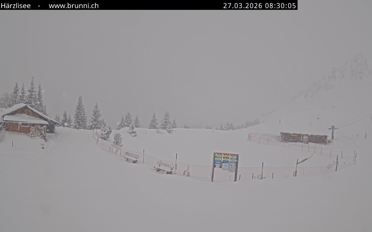 Archived webcam image showing Engelberg: Lake Härzlisee & mountain restaurant Kräuterhütte on 27 Mar 2026 at 08:00 07:00