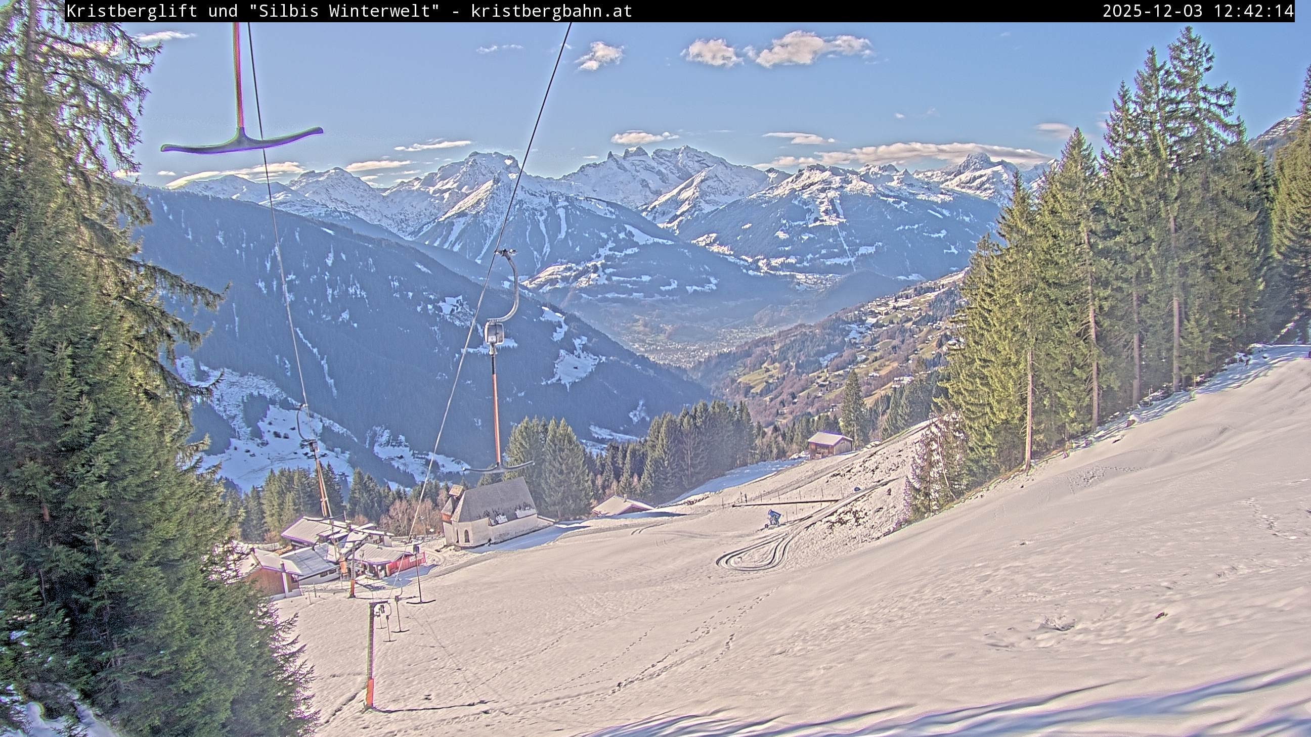 The webcam shows the view at Kristberglift and slope in ski resort Silbertal-Kristberg, Montafon. One also can spot the restaurant "Panoramagasthof Kristberg" and St. Agatha chapel, as well as Verwall-and Rätikon mountain chain.