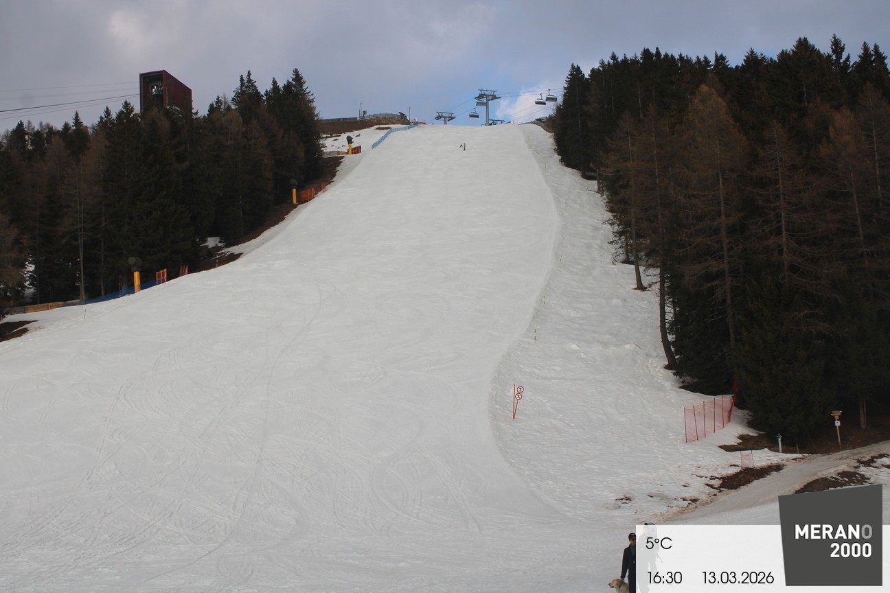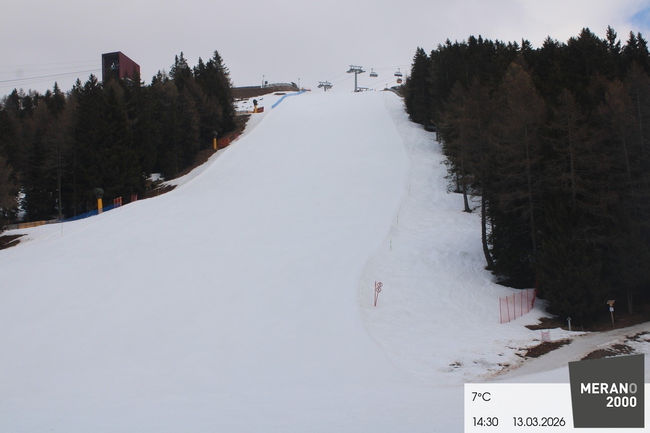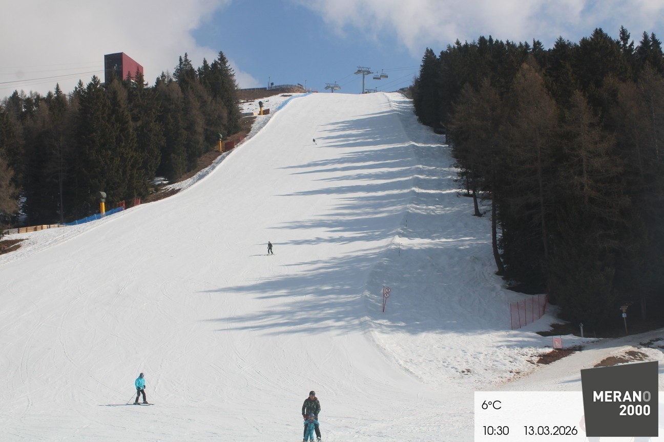 Your view of the steep slope Falzleben II in the ski area Meran 2000. Furthermore you can see the top stations of the ropeway and the chair lift Wallpach.