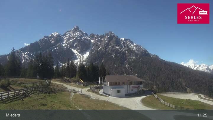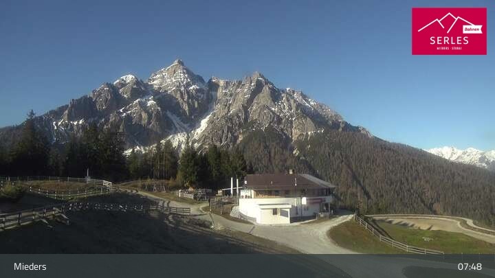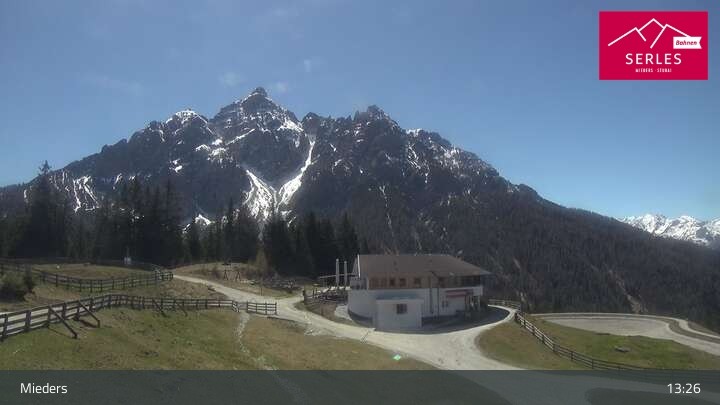 A glorious view towards the mountain Serles, as well as the toboggan run and the Waldrasteck slope in the Tyrolean ski resort of Mieders. One can also spot the mountain station of the cable car „Serlesbahn“ at the 1,600 meter high Koppeneck, the Koppeneck ski hut with playground and the reservoir.