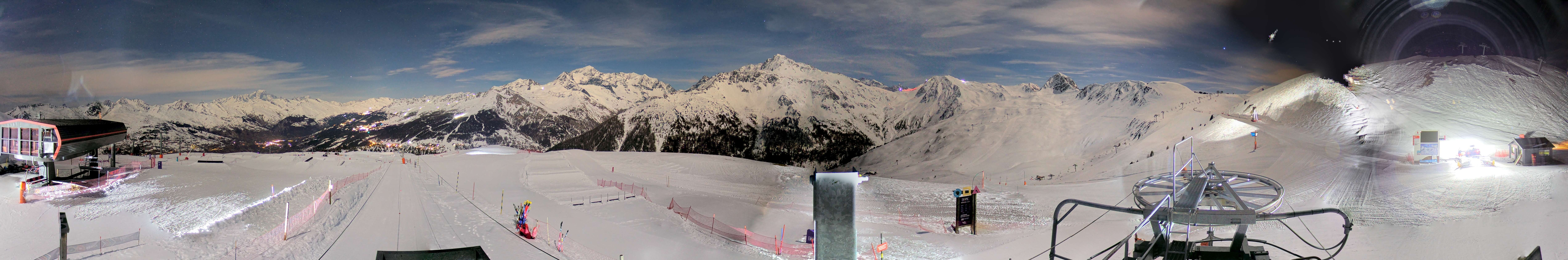 This webcam shows the ski resort La Plagne. In the foreground one can see the top station of chairlift Bijolin.