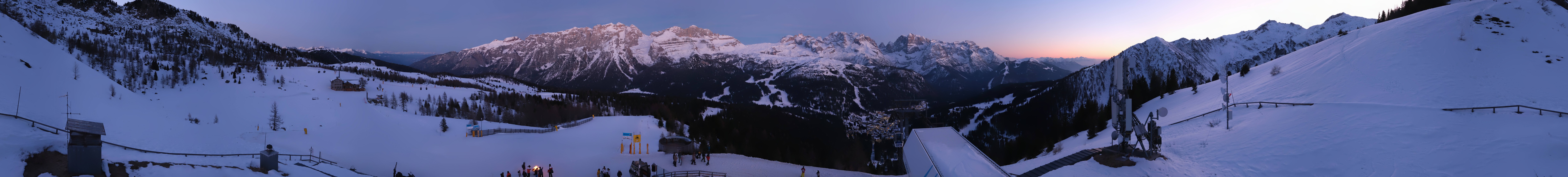 Amazing view from the top station of the gondola Pradalago Express in Madonna di Campiglio. It is the starting point of the easy slope Pradalago Facile and the advanced run Amazzonia. In the background you can see the chair lifts Fortini Express and Zeledria Express and the Rifugio Viviani.