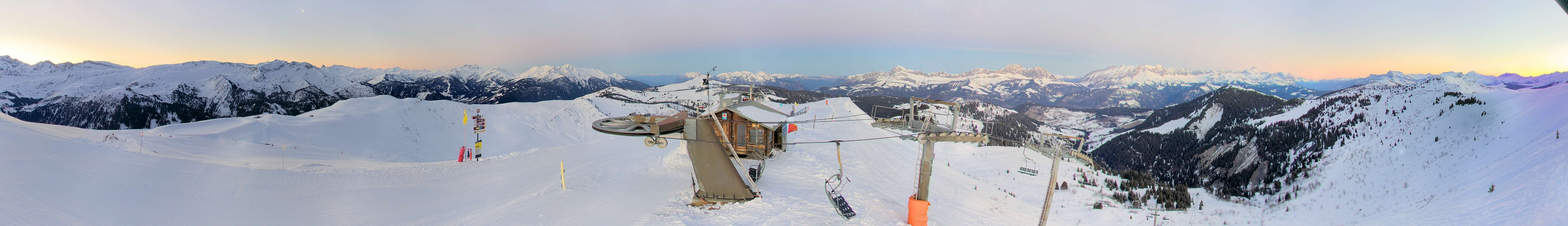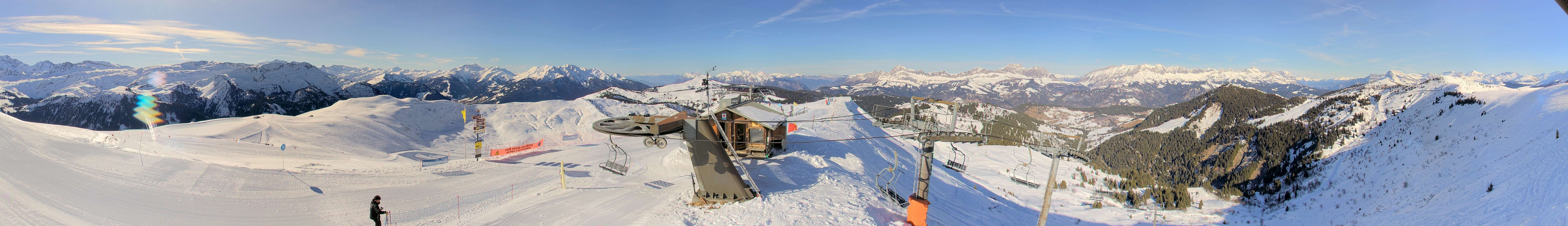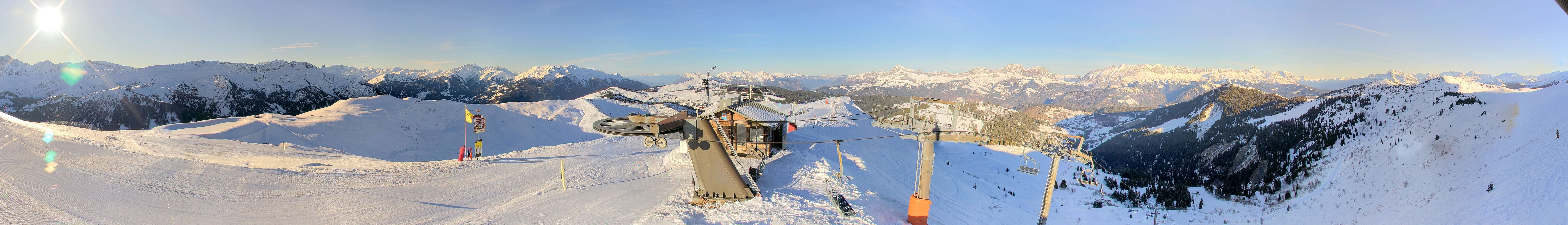 The webcam is situated at "Sommet de l´Espace Diamant" summit and shows the mountain station of Plan de Fours chair lift, Notre Dame de Bellecombe.