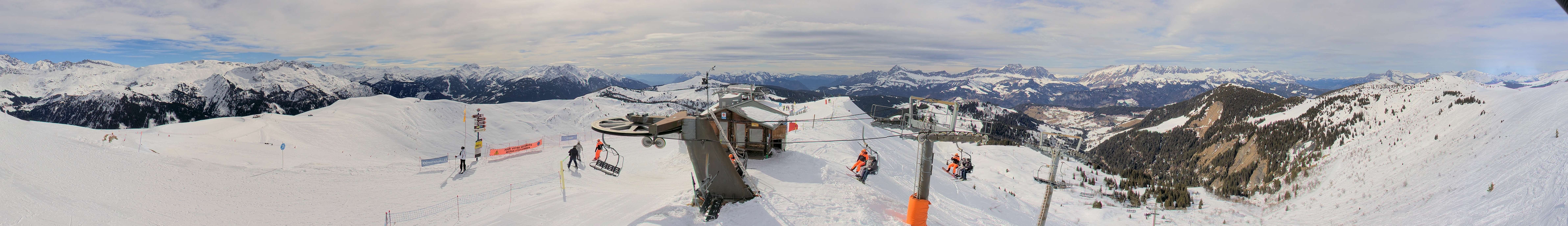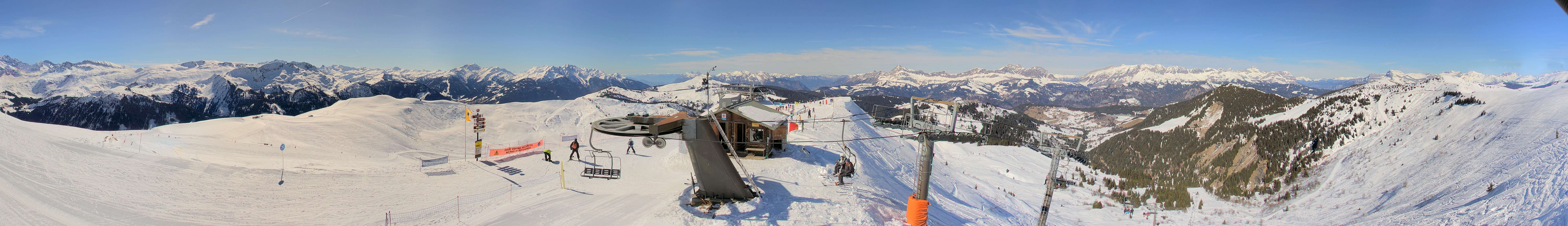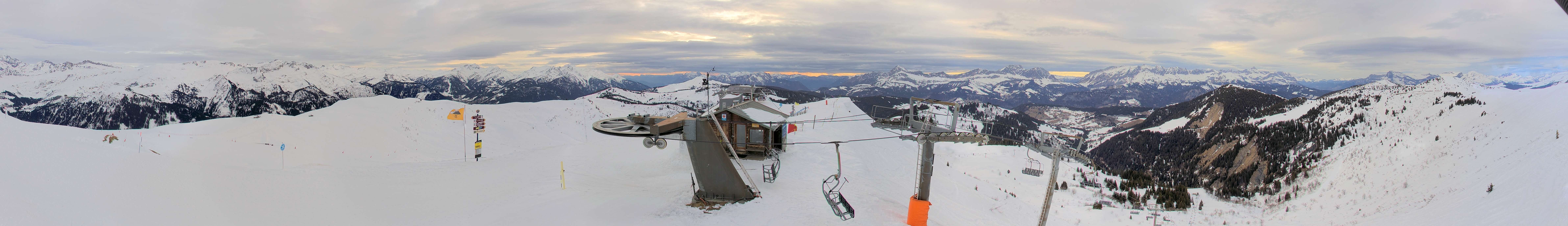 The webcam is situated at "Sommet de l´Espace Diamant" summit and shows the mountain station of Plan de Fours chair lift, Notre Dame de Bellecombe.