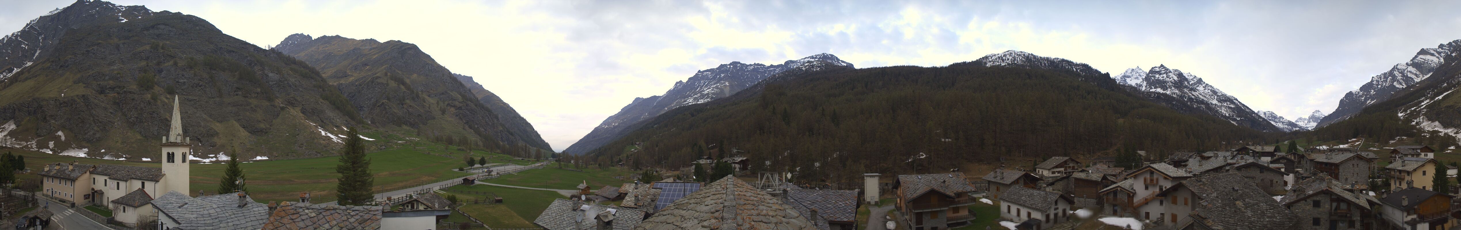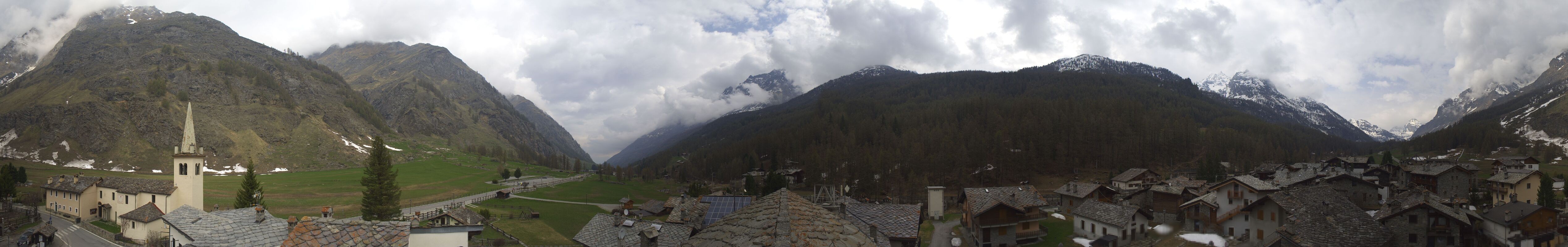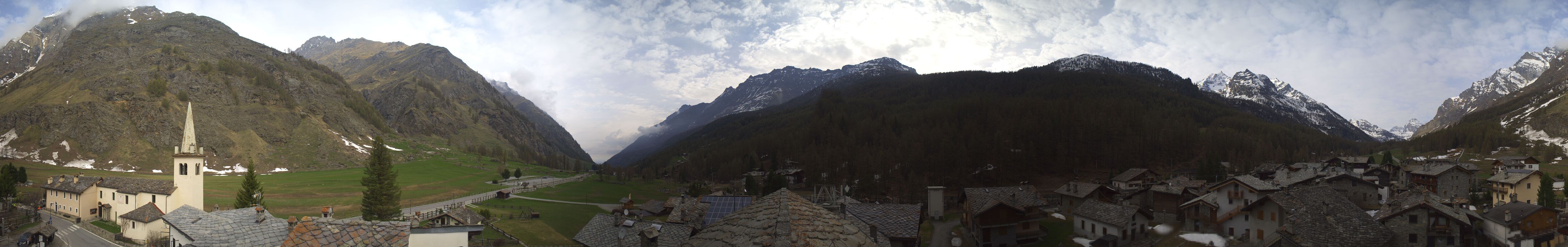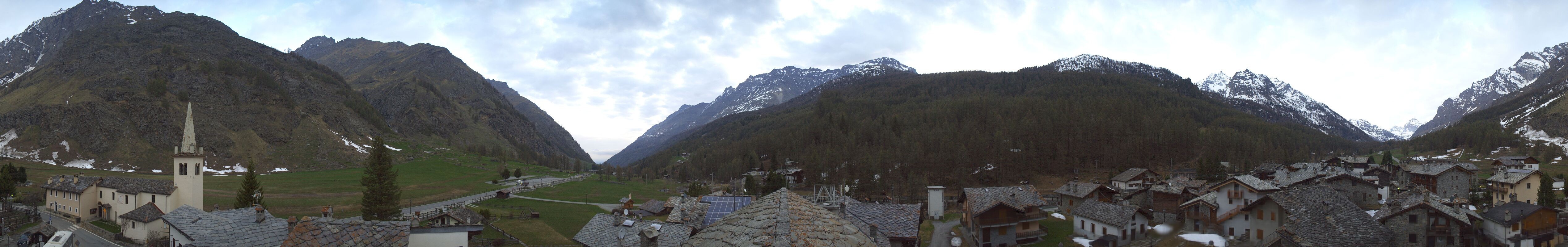 The camera shows the mountain village of Rhemes-Notre-Dame and the surrounding mountains in the Aosta Valley.