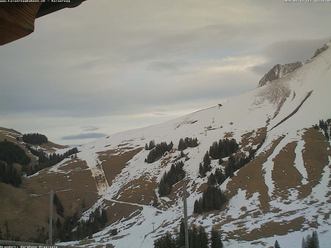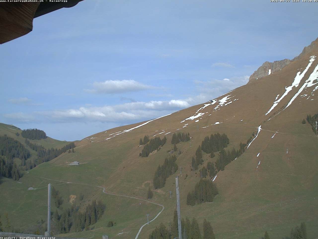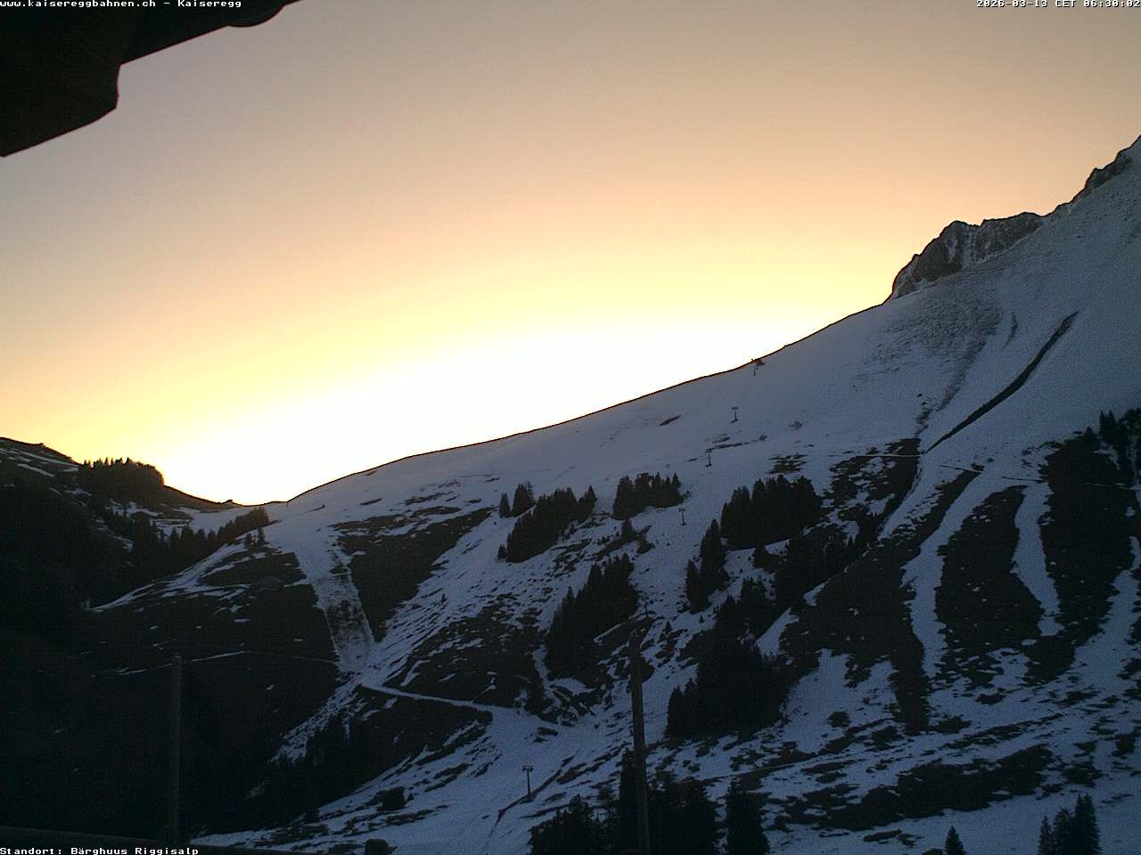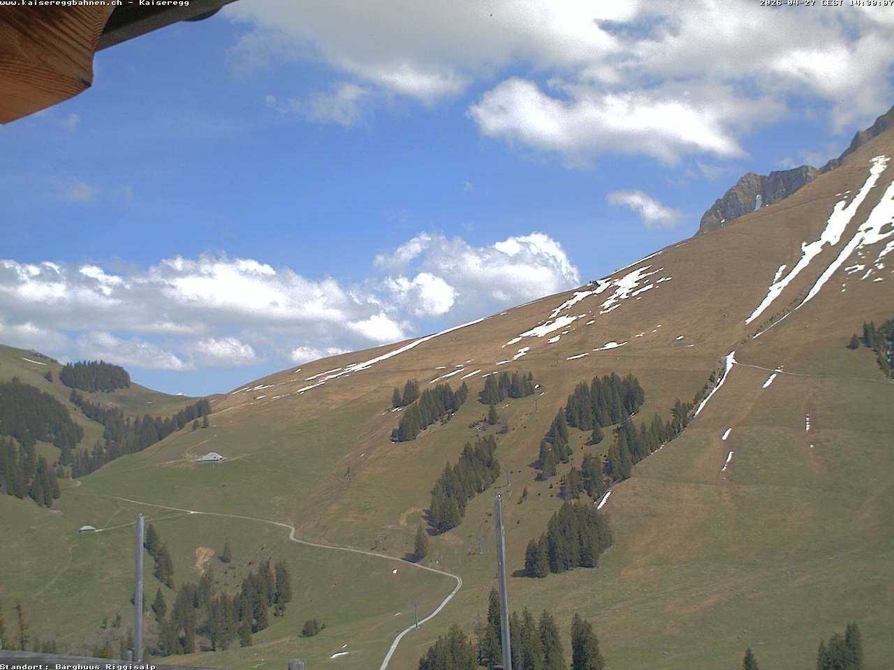 From the mountain hut Bärghuu Riggisalp, this webcam offers the view towards chairlift Kaiseregg. It is located in ski resort Schwarzsee Riggisalp Kaiseregg.