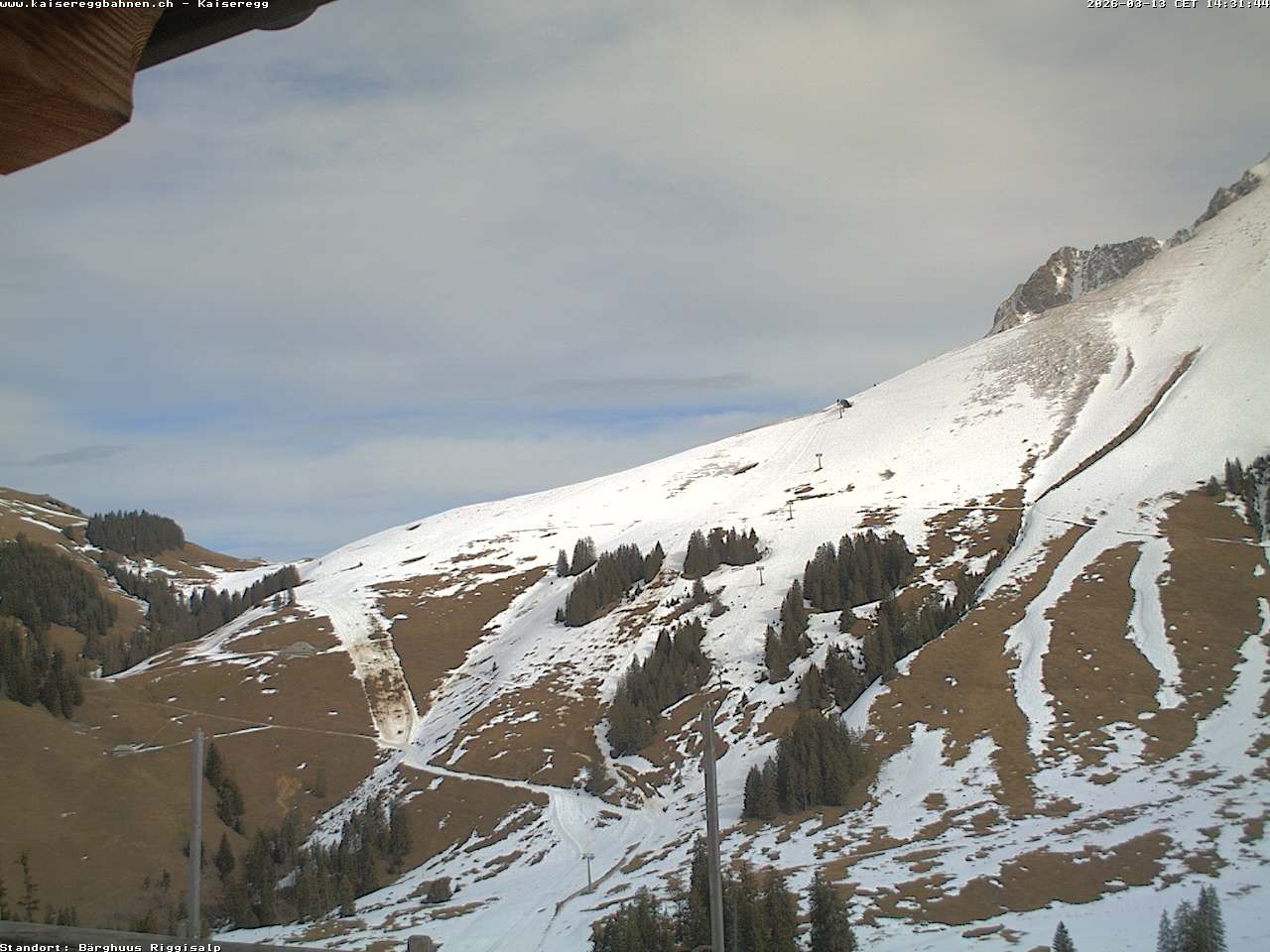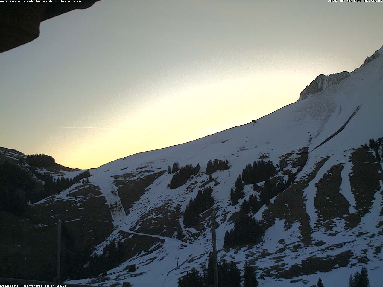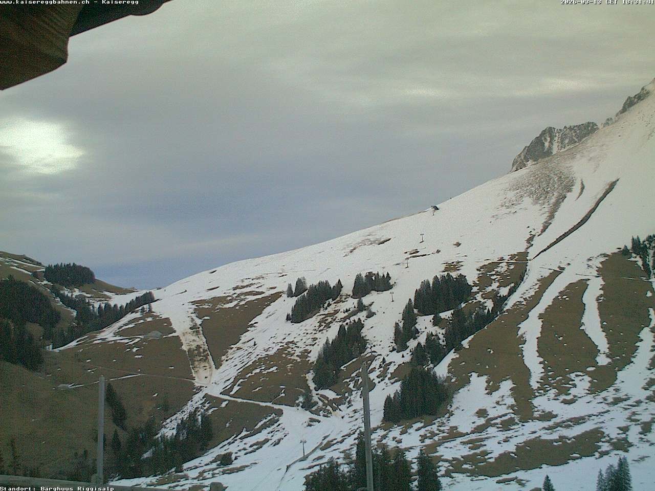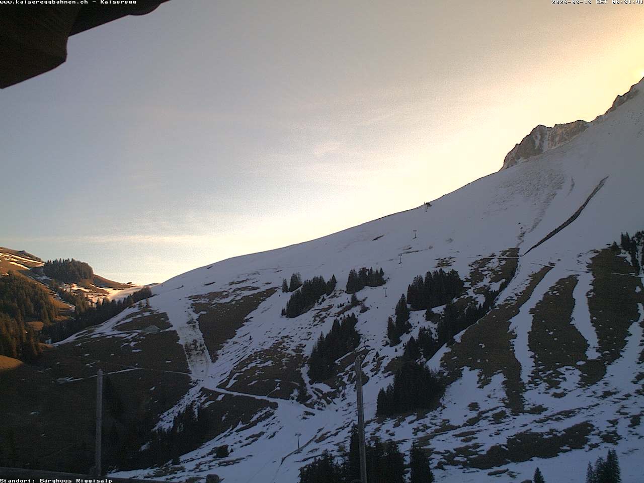 From the mountain hut Bärghuu Riggisalp, this webcam offers the view towards chairlift Kaiseregg. It is located in ski resort Schwarzsee Riggisalp Kaiseregg.