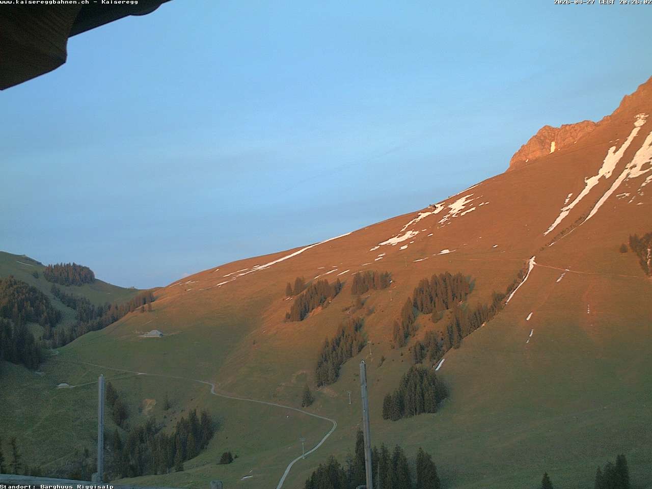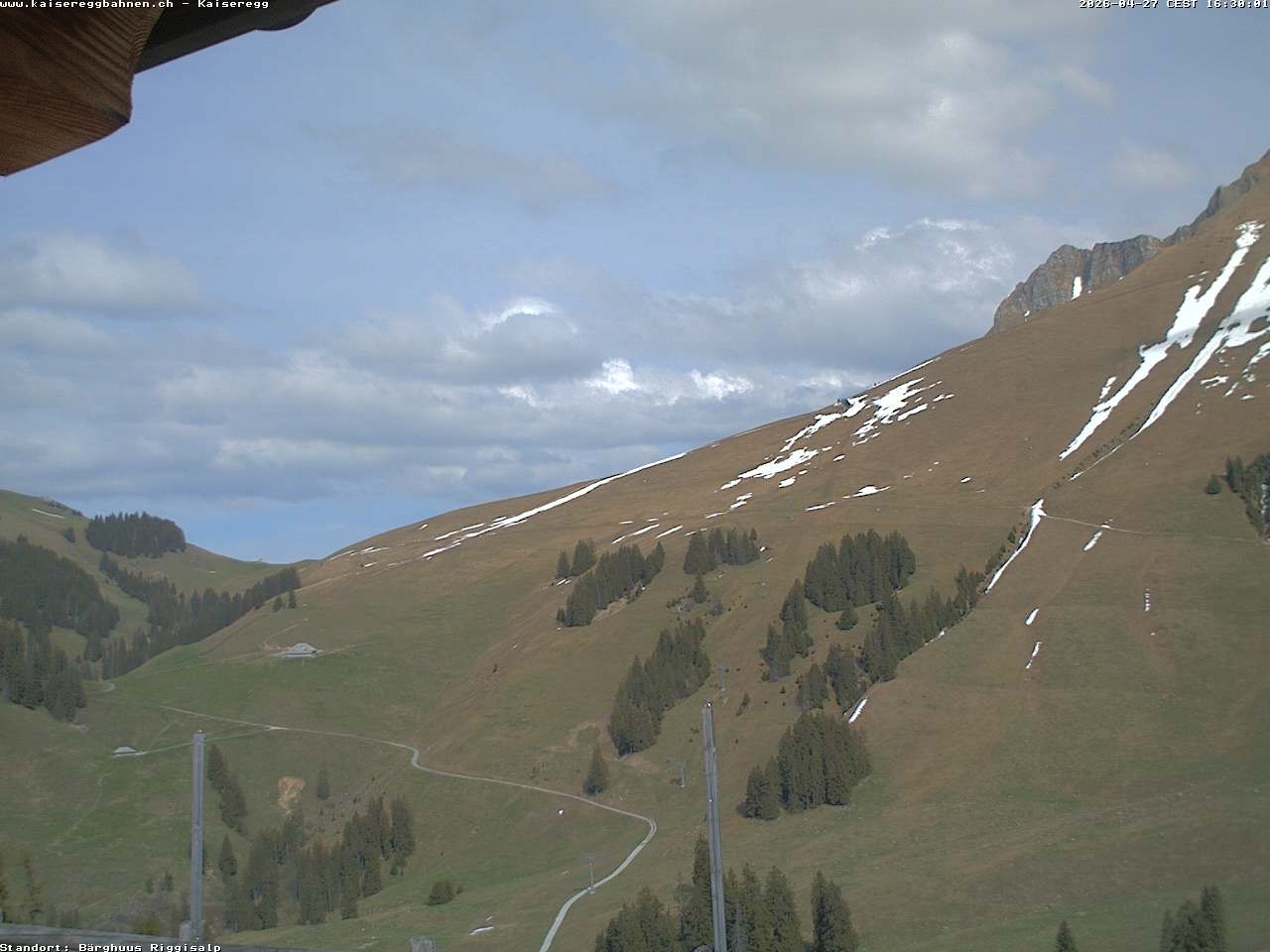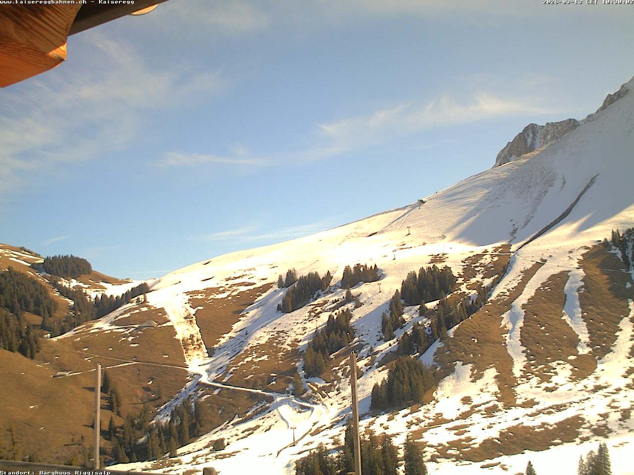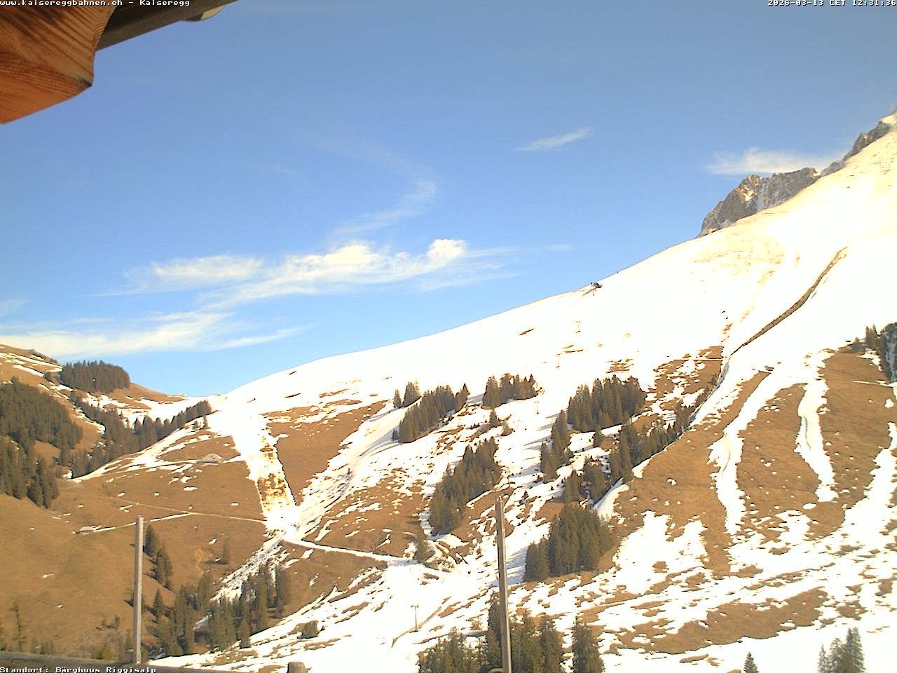 From the mountain hut Bärghuu Riggisalp, this webcam offers the view towards chairlift Kaiseregg. It is located in ski resort Schwarzsee Riggisalp Kaiseregg.