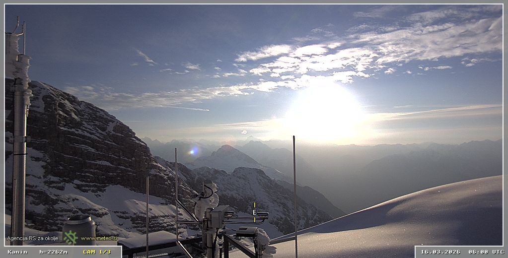Archiviertes Webcam Bild: Skigebiet Sella Nevea - Bovec Kanin - Blick nach Osten am 16.03.2026 um 06:23 Uhr 06:00