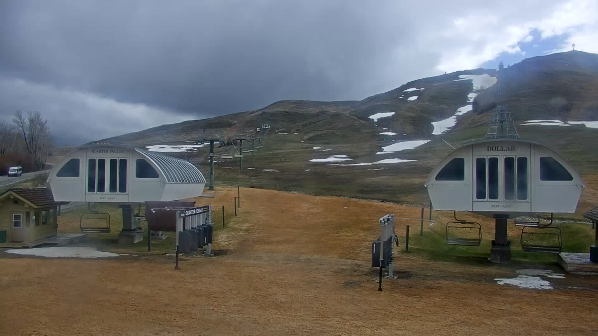 This webcam shows Quarter Dollar chairlift (left) at the ski resort Sun Valley. You can also see parts of Dollar, another quad chair leading up Dollar Mountain.