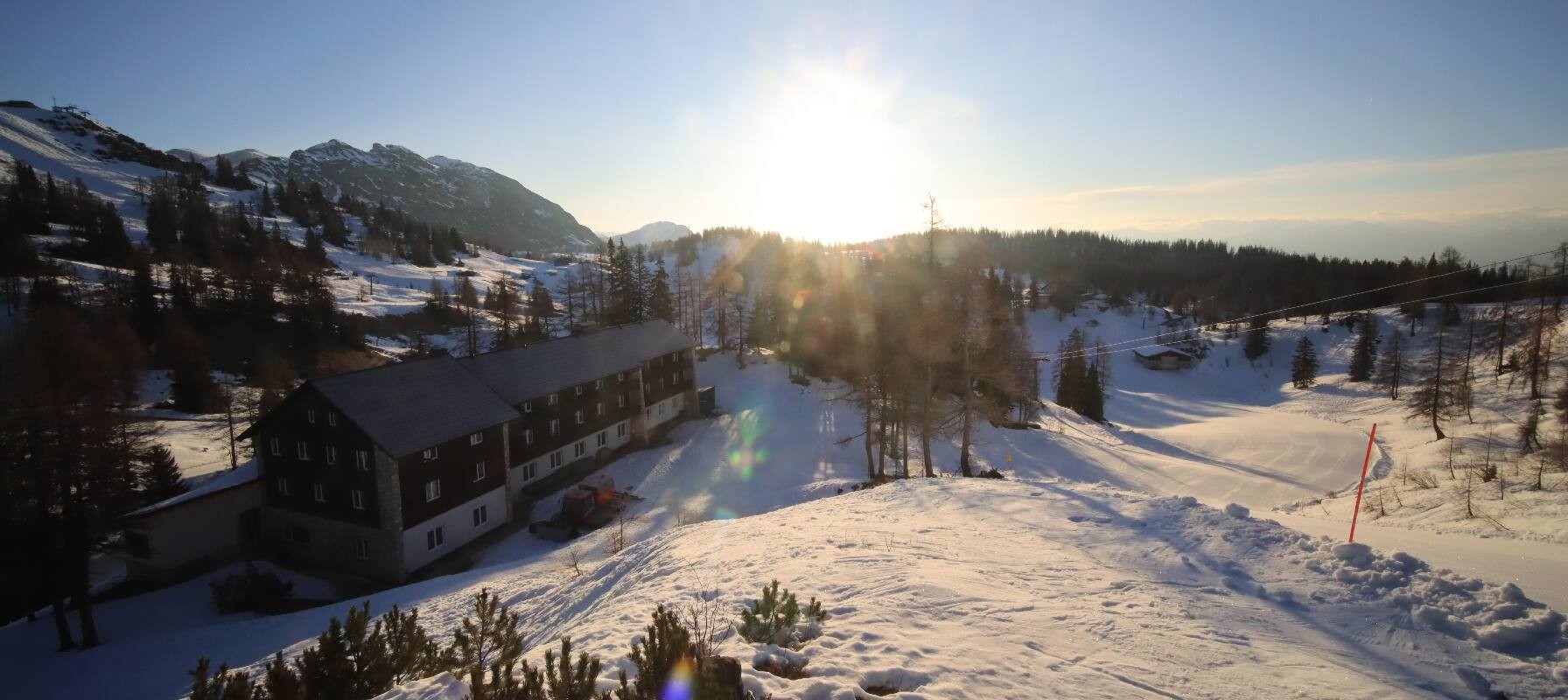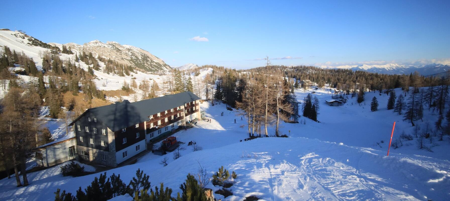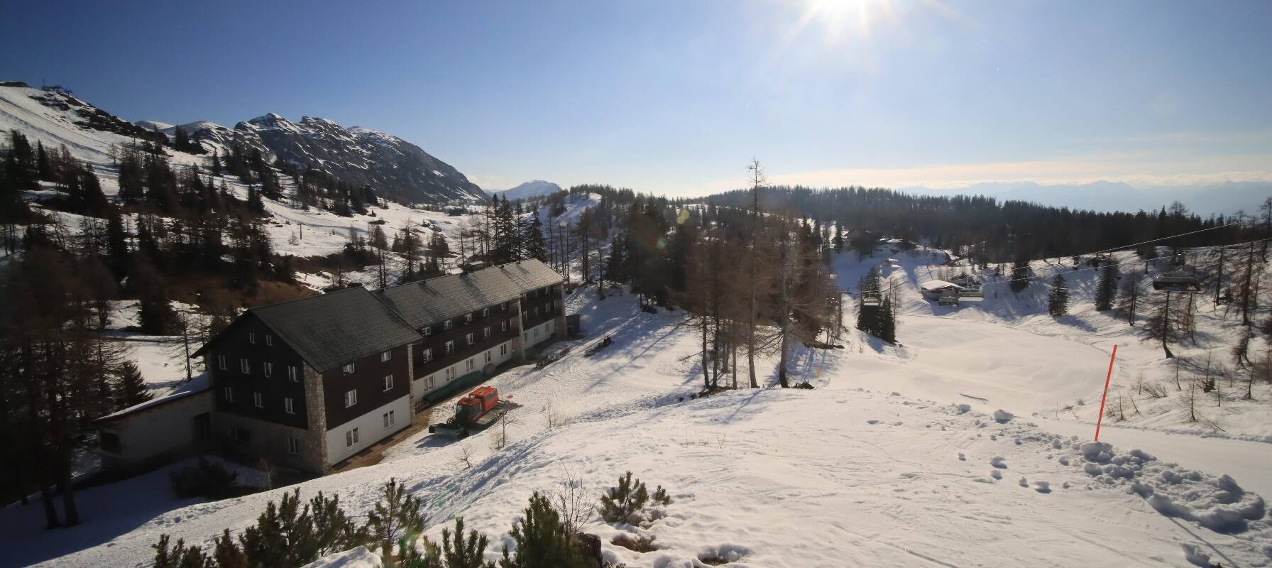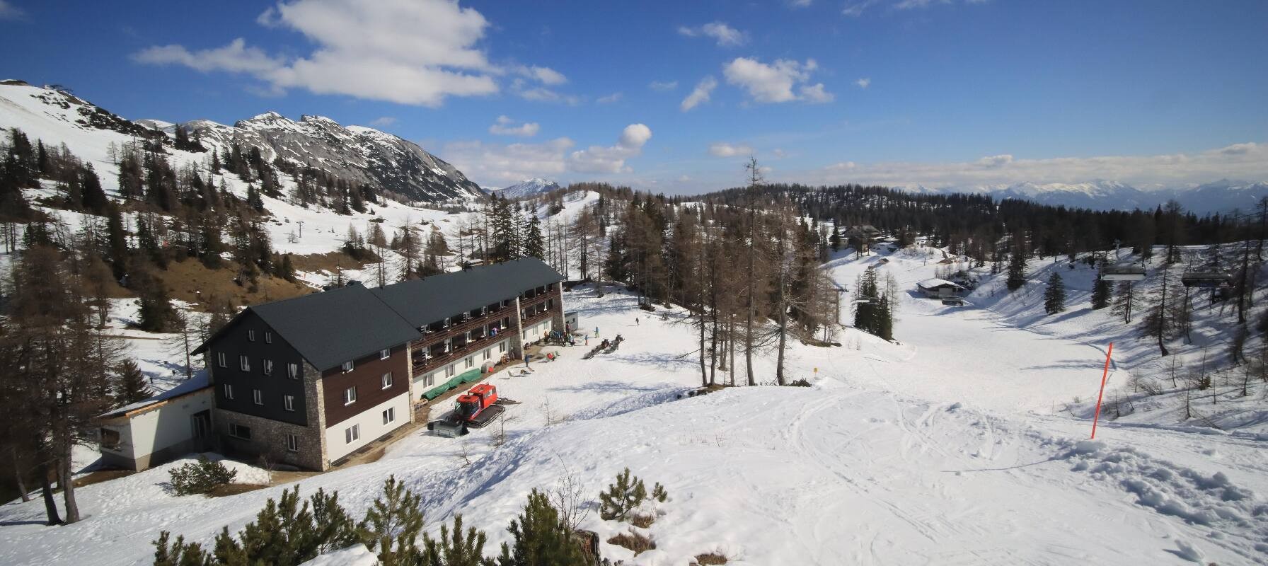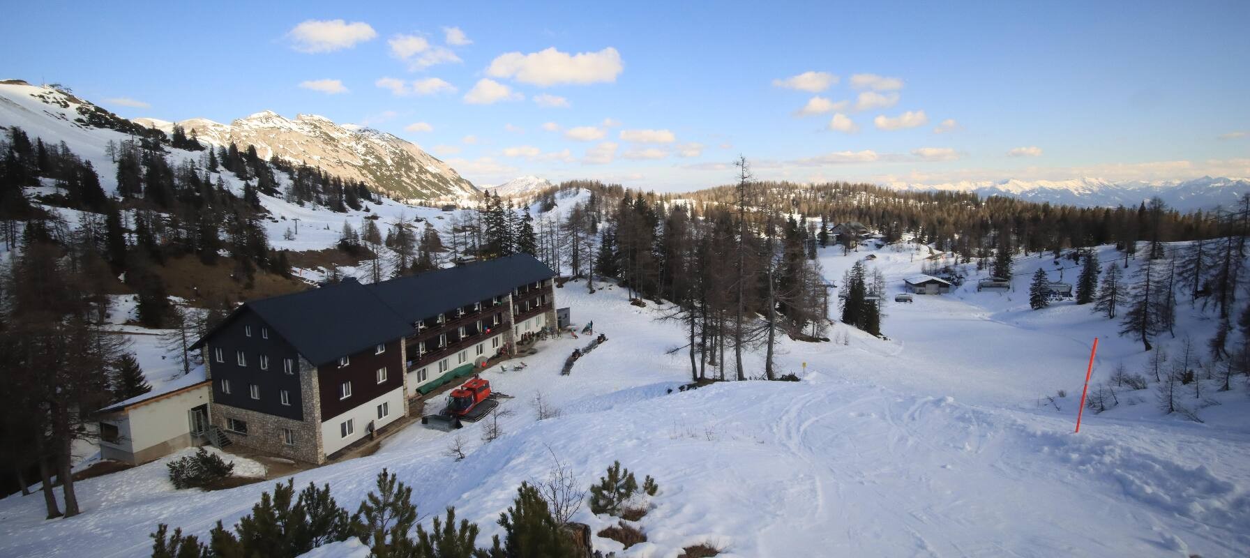 The camera shows the Haus Alpin at the Lawinenstein lift in the Tauplitz ski area. In the background you can also see the Hollhaus.