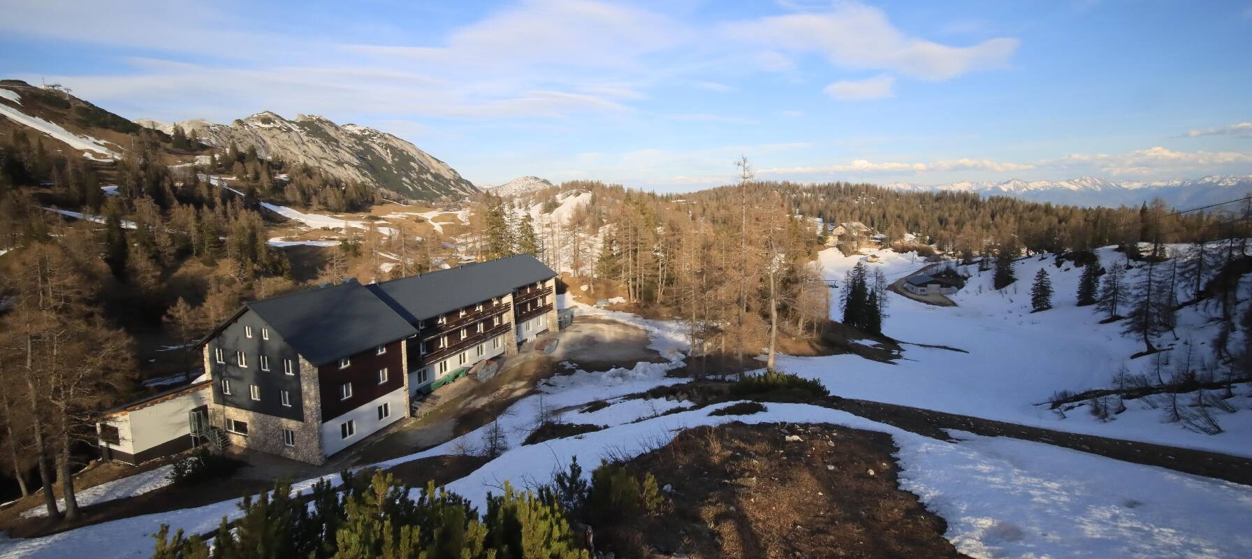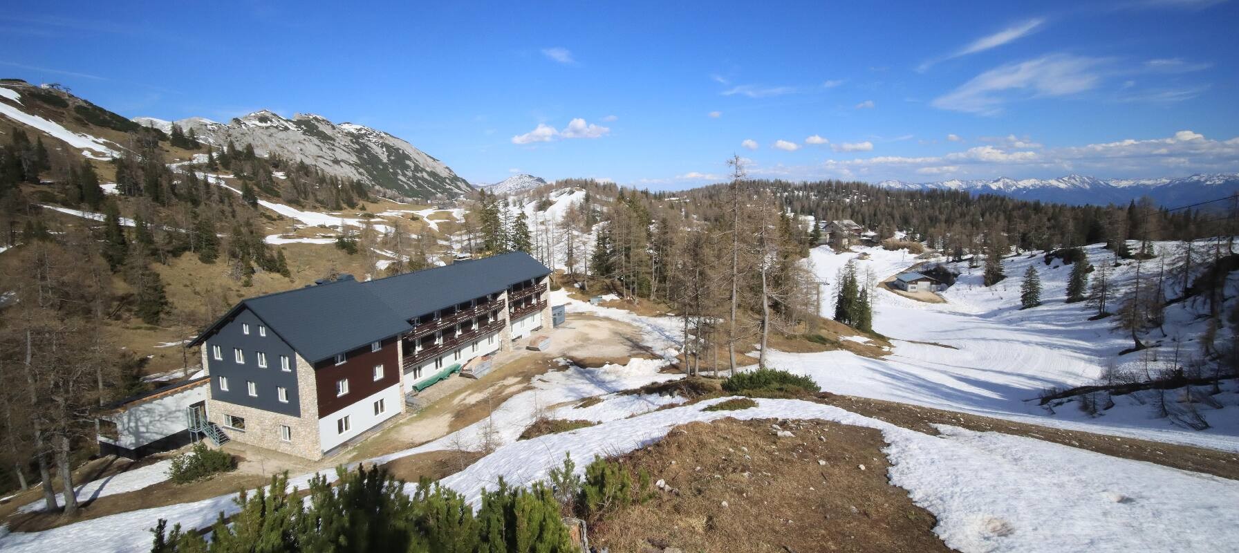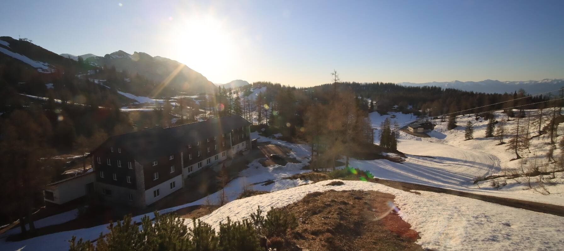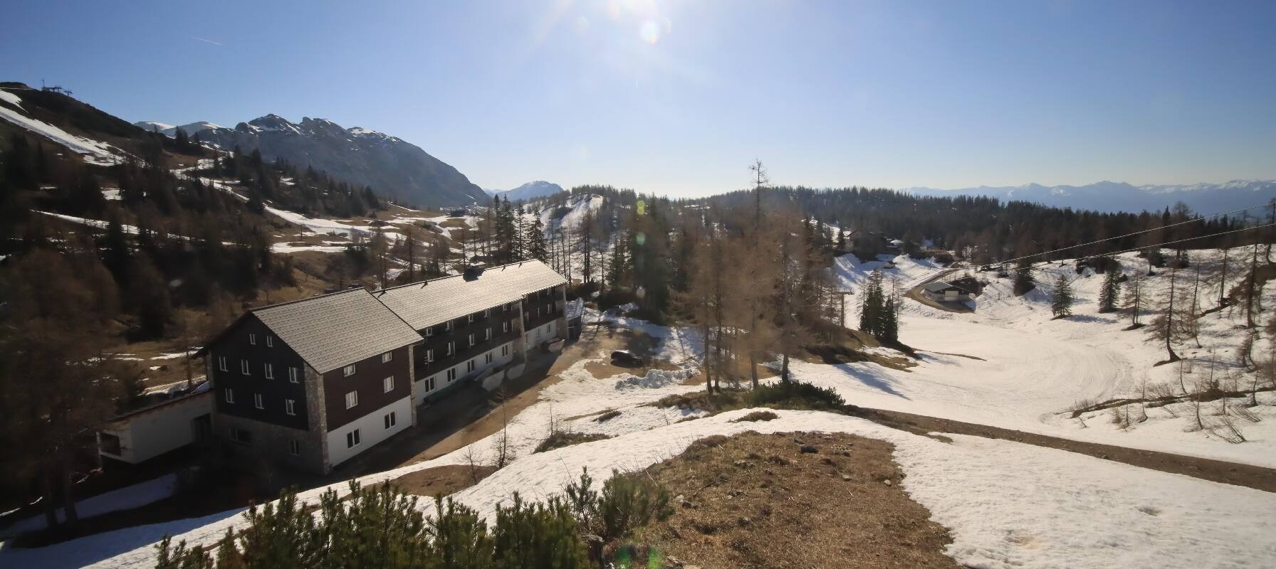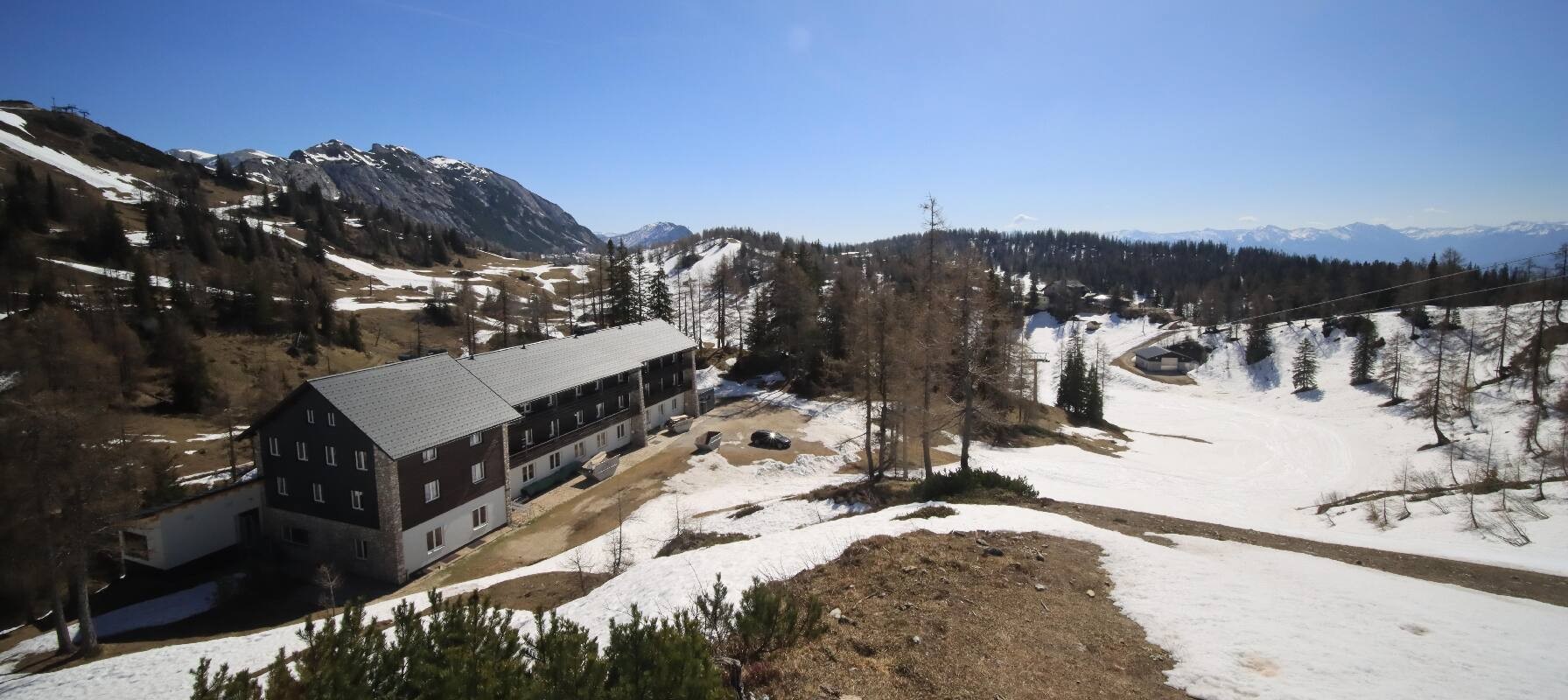 The camera shows the Haus Alpin at the Lawinenstein lift in the Tauplitz ski area. In the background you can also see the Hollhaus.