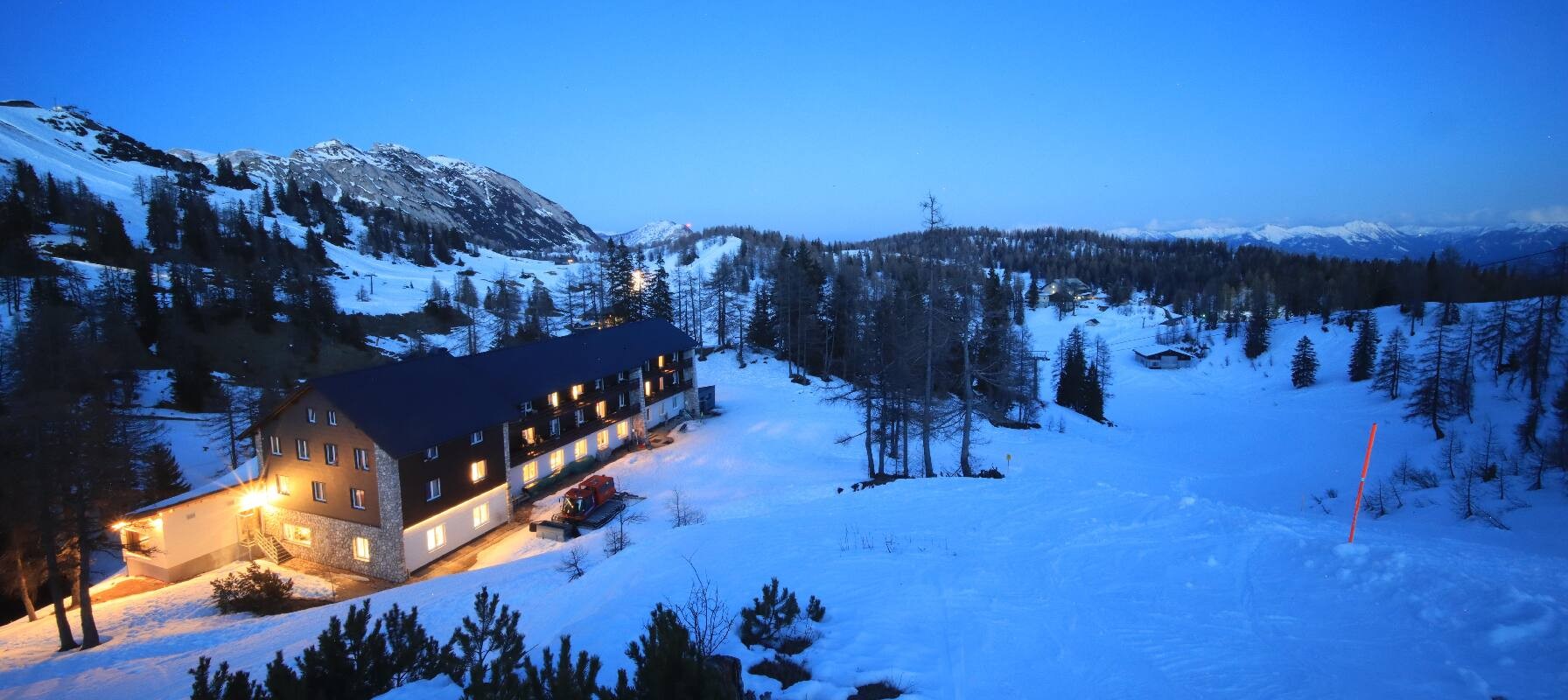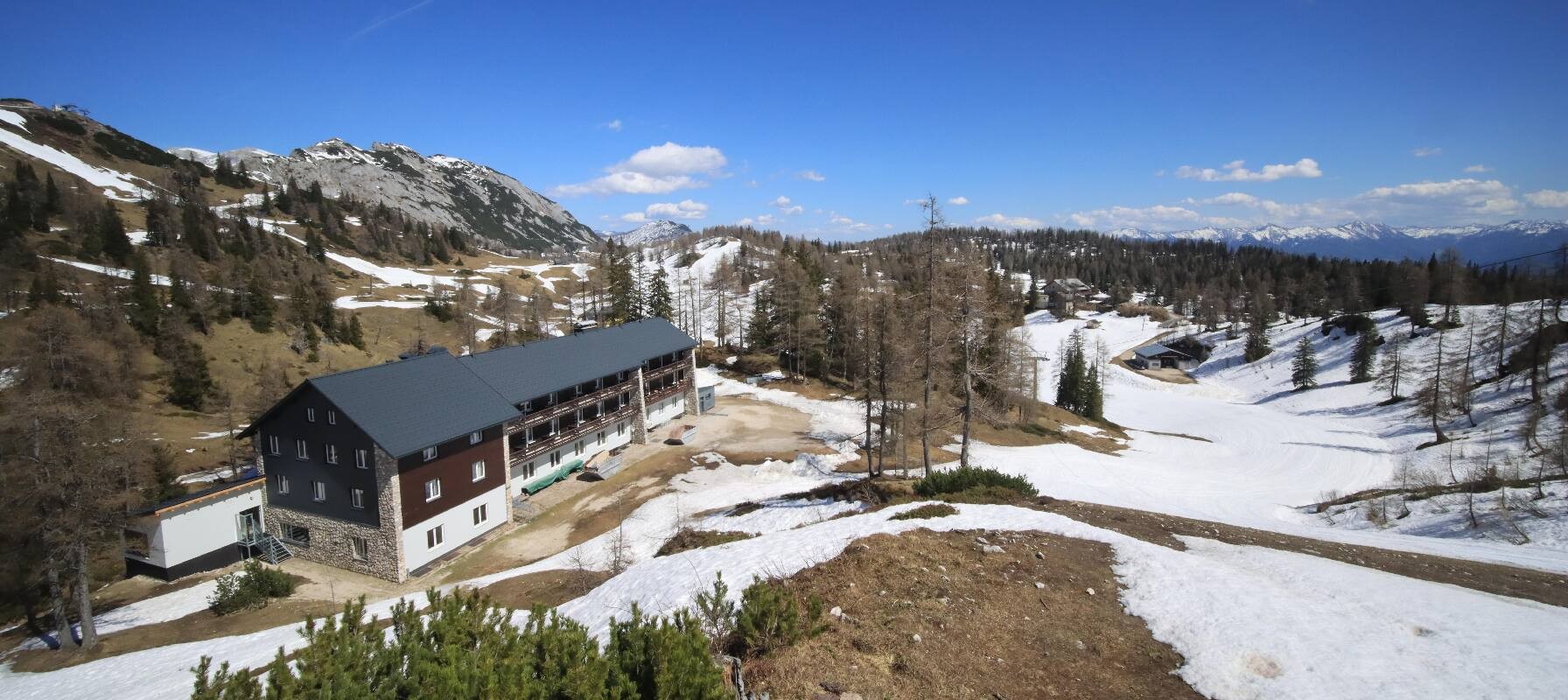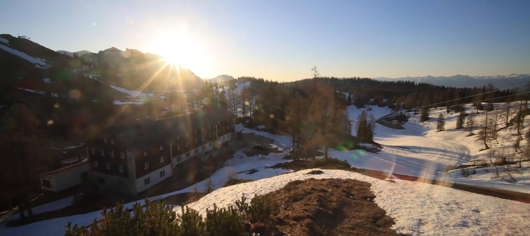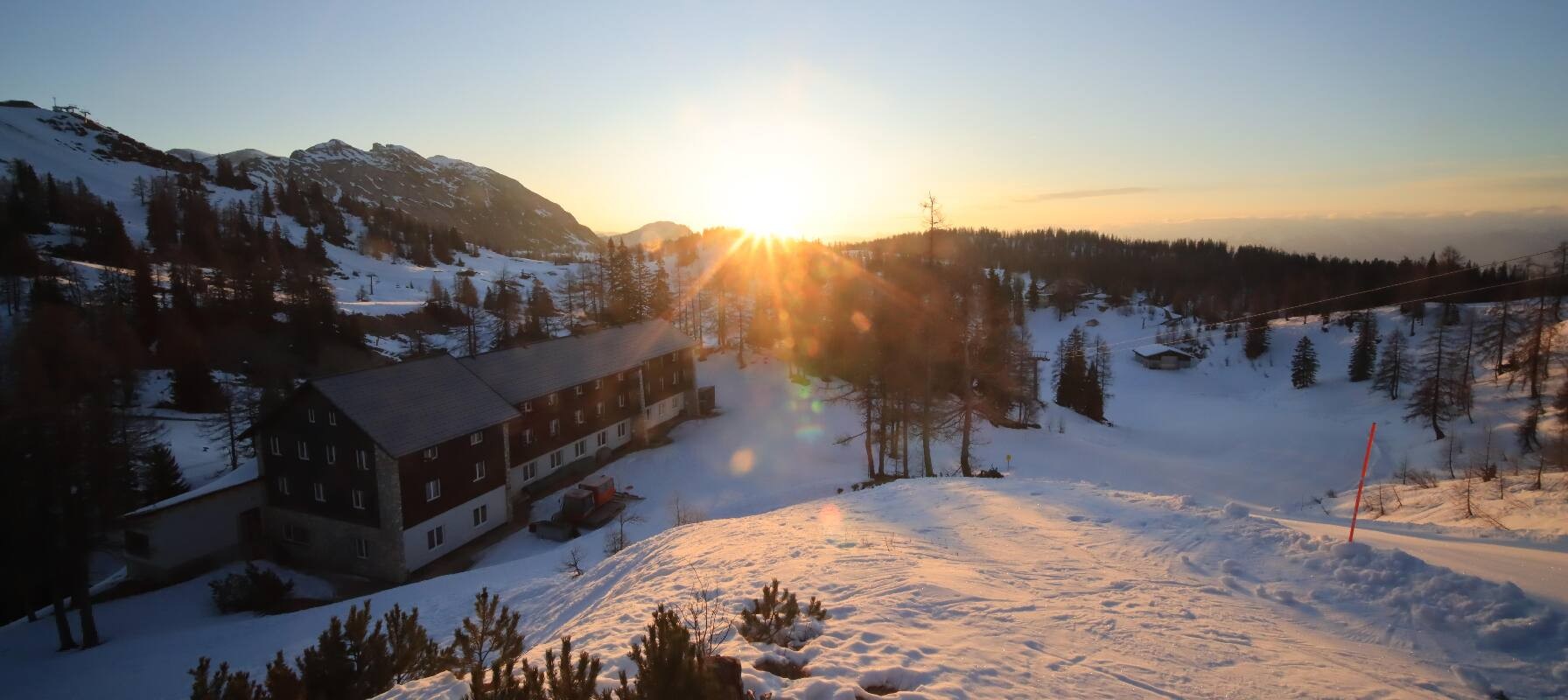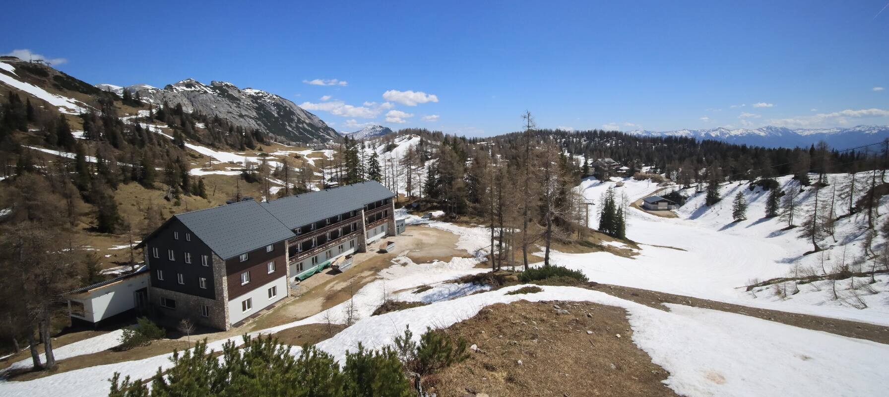 The camera shows the Haus Alpin at the Lawinenstein lift in the Tauplitz ski area. In the background you can also see the Hollhaus.