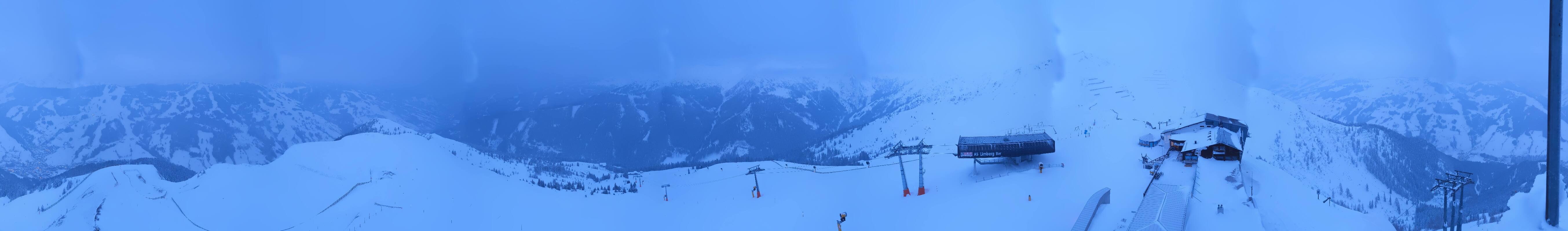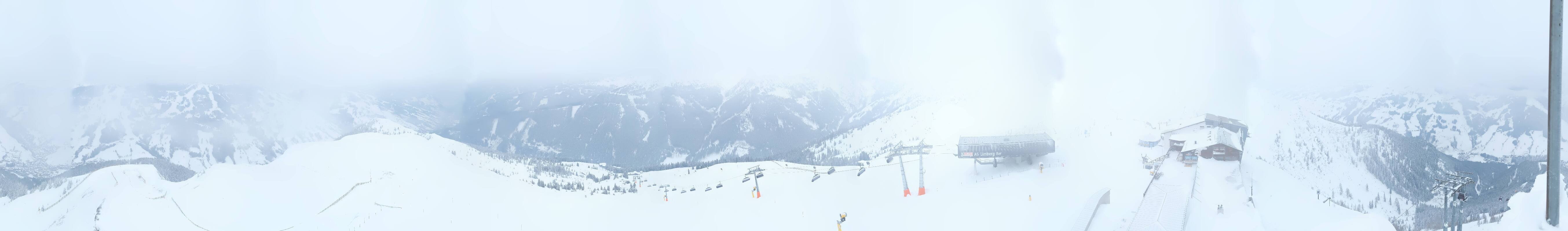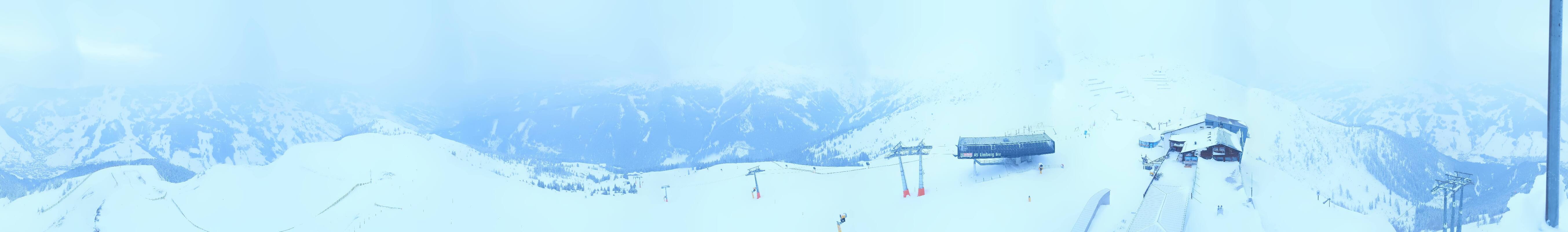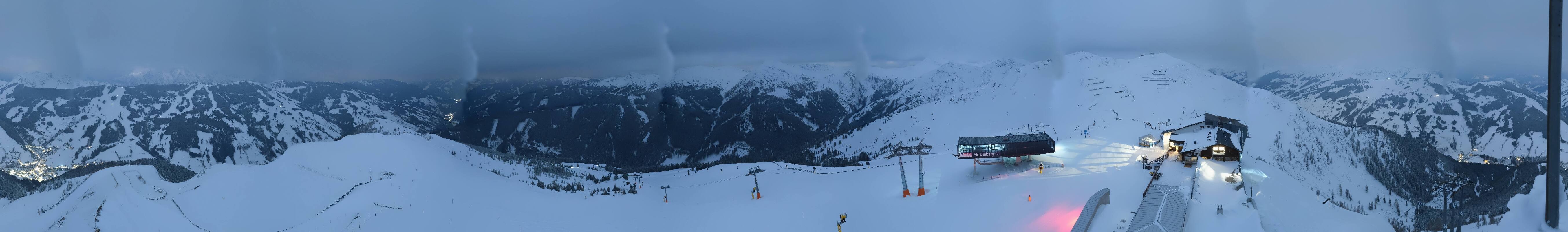 Enjoy the view at the top station of the Schattberg X-press II (2.010m) in the ski area Saalbach Hinterglemm Leogang Fieberbrunn towards Limberg run, Sky Rest and Saalbach.