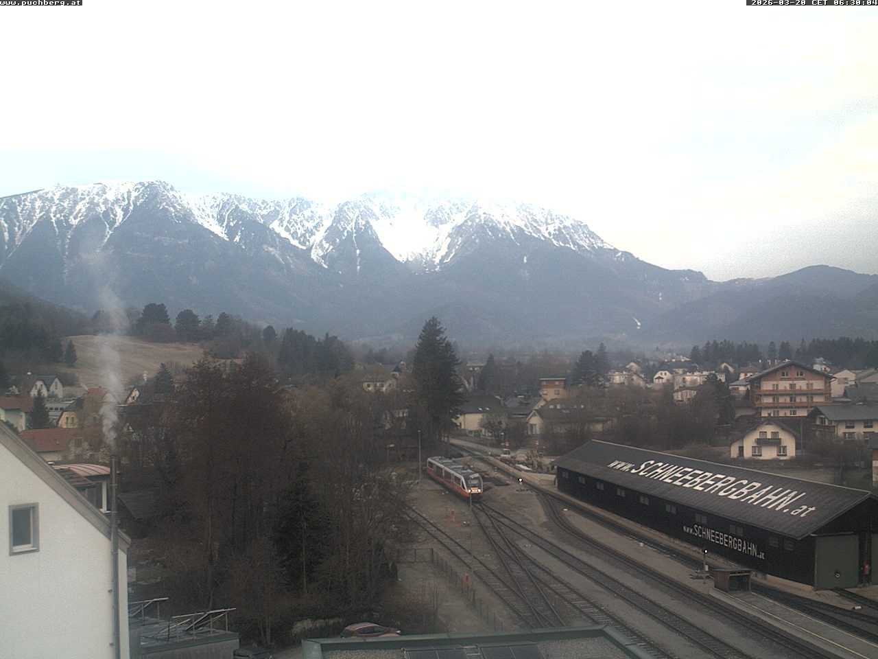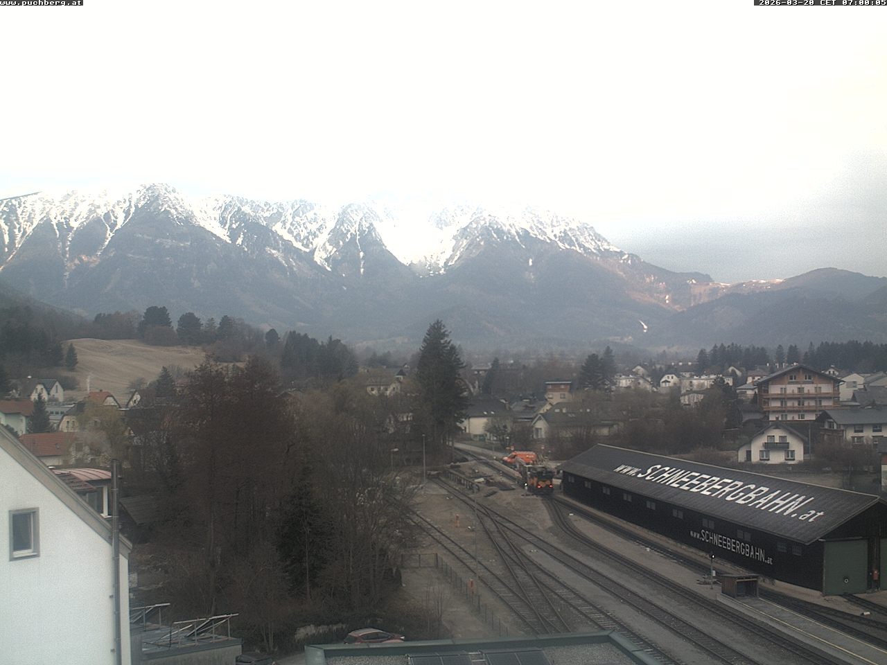 Archived webcam image showing Train station Puchberg - view to the Schneeberg on 20 Mar 2026 at 07:05 06:00