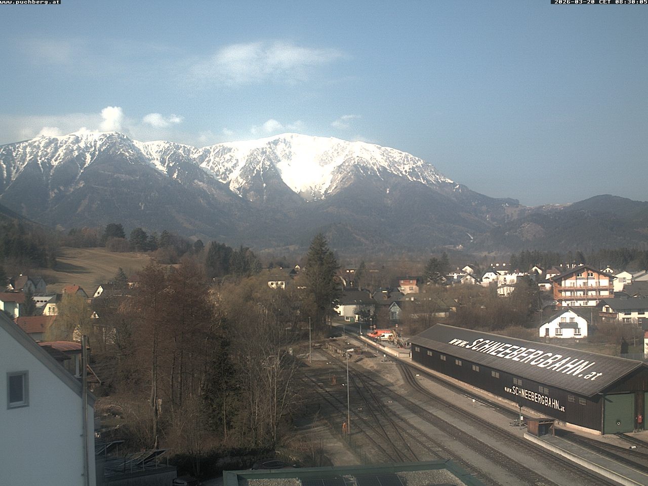 Archived webcam image showing Train station Puchberg - view to the Schneeberg on 20 Mar 2026 at 08:05 07:00