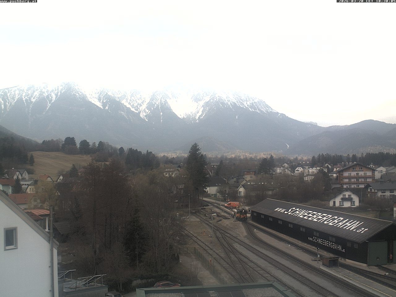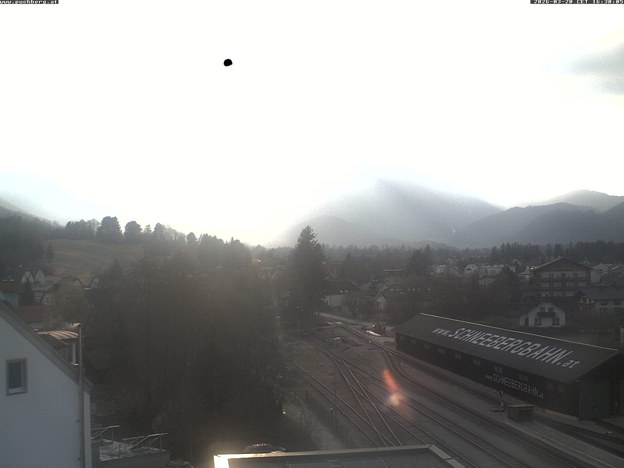 Archived webcam image showing Train station Puchberg - view to the Schneeberg on 20 Mar 2026 at 16:05 Latest
