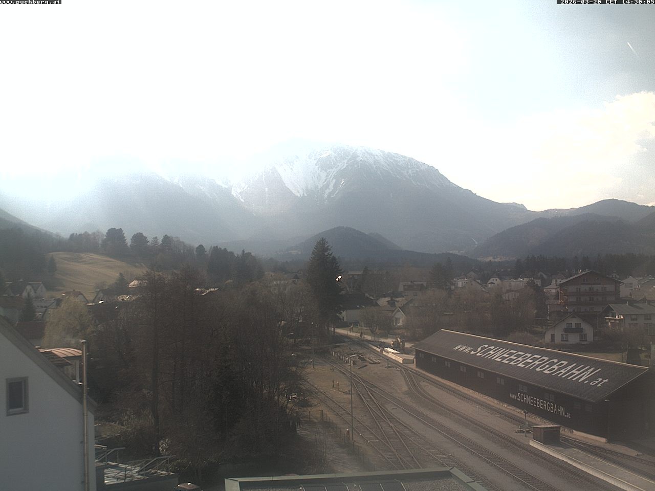 Archived webcam image showing Train station Puchberg - view to the Schneeberg on 20 Mar 2026 at 14:05 13:00