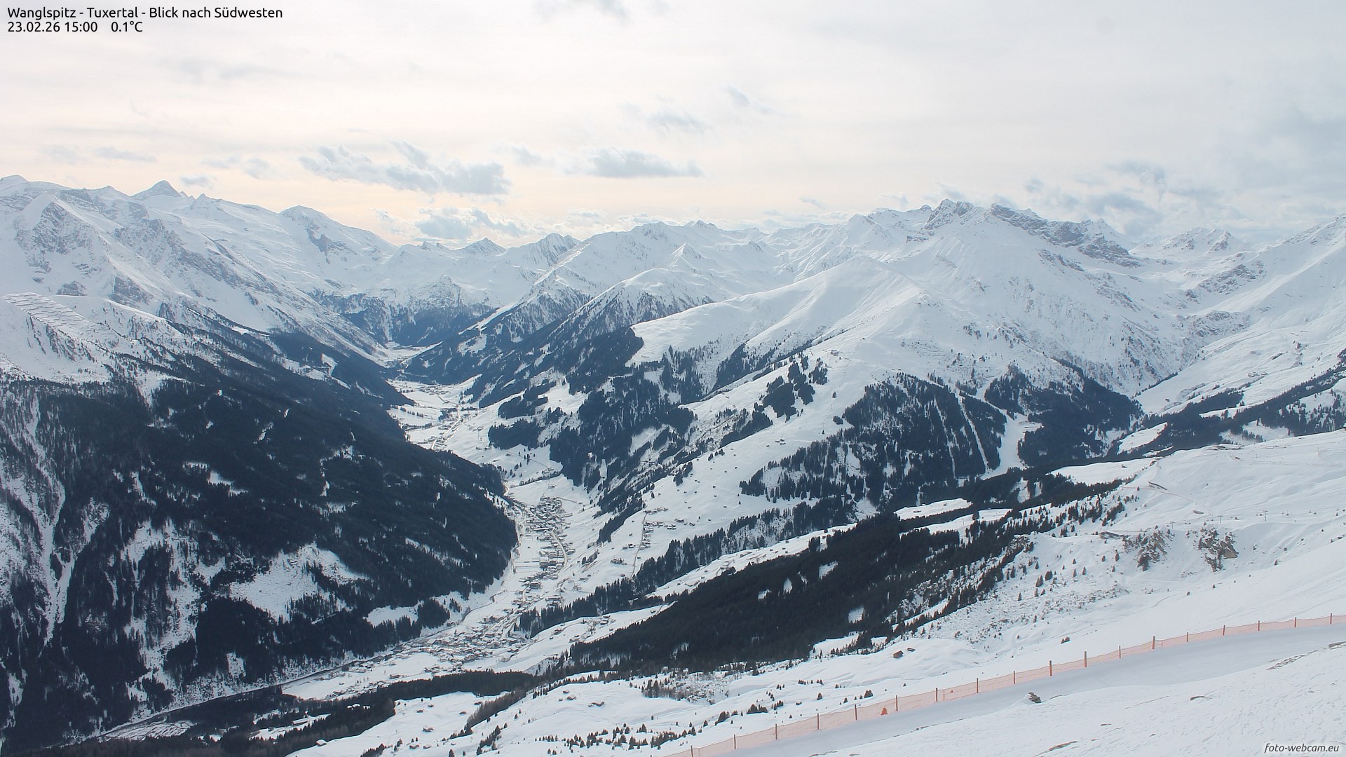 View of Wanglspitz direction southwest. In the foreground some Tux districts can be spotted. On the left Hintertux glacier can be seen. In the middle are the ski resorts Rastkogel an Eggalm located.