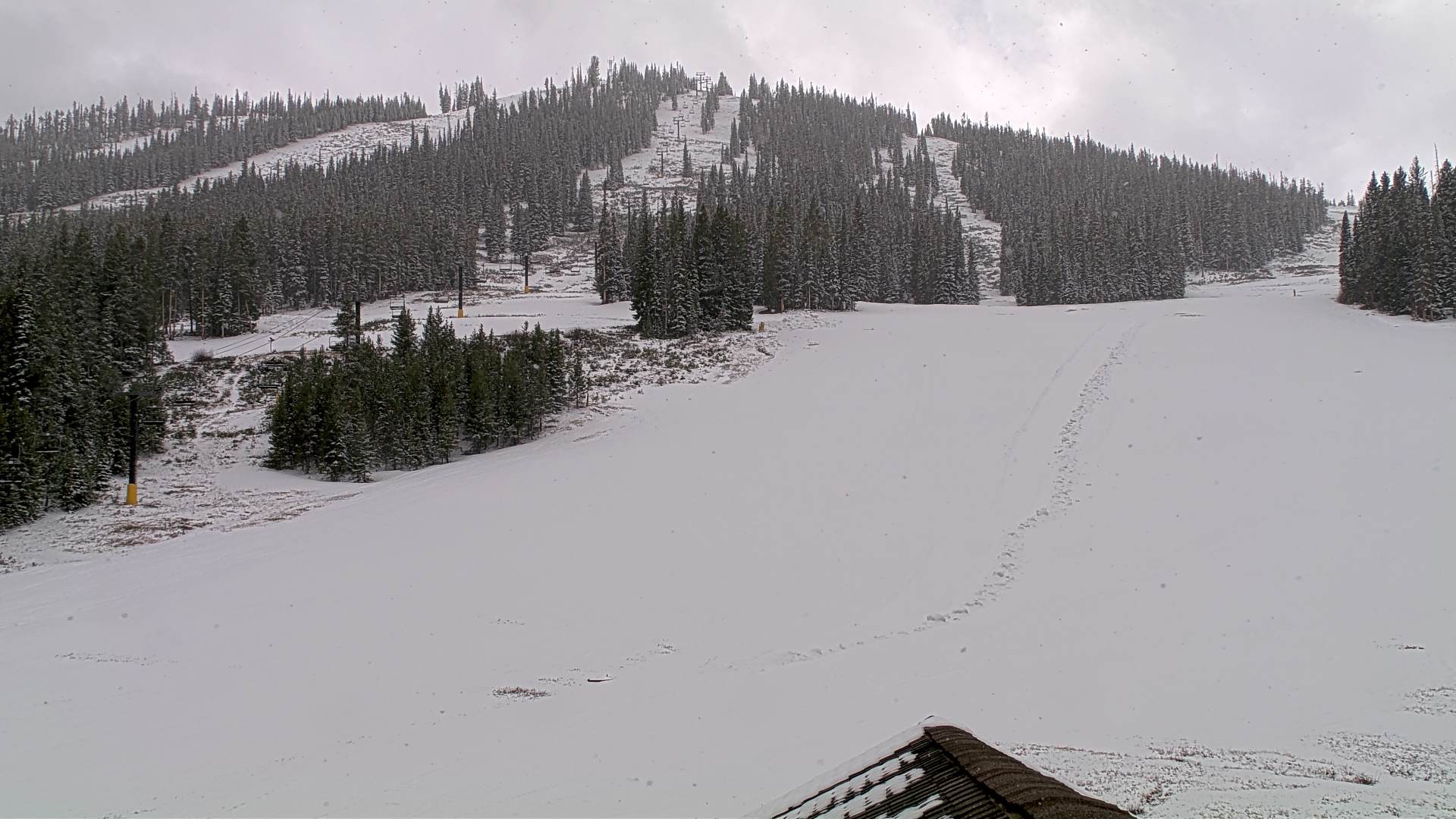 The webcam faces the Winter Park ski area from restaurant Snoasis at the base of the Eskimo Express.