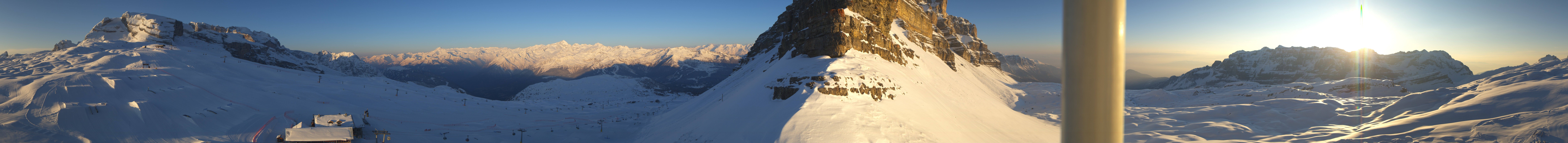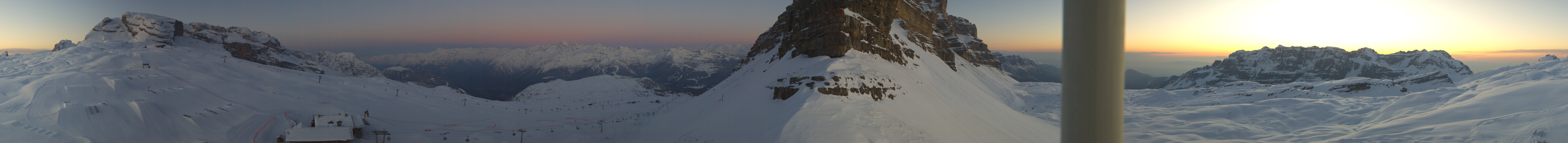 Panoramic view of the Passo Grostè in Madonna di Campiglio. You can see the Ursus Snow Park, the gondola and the chair lift Grostè Express. The mountain hut Rifugio Graffer is located below the snow park.