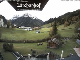 The webcam is located at Laerchenhof Nature Hotel and shows the mountain village Mittelberg in the Kleinwalsertal region.